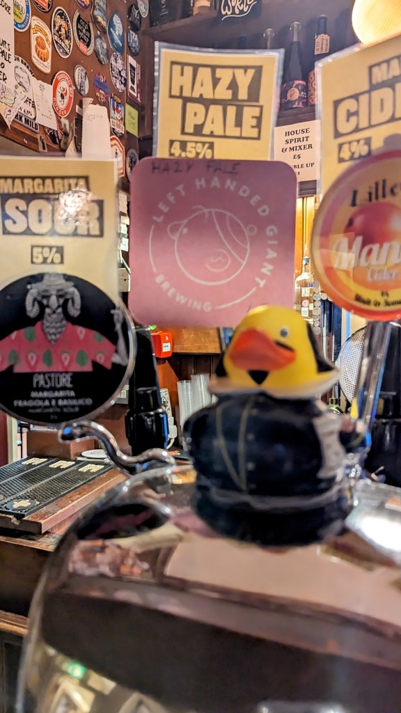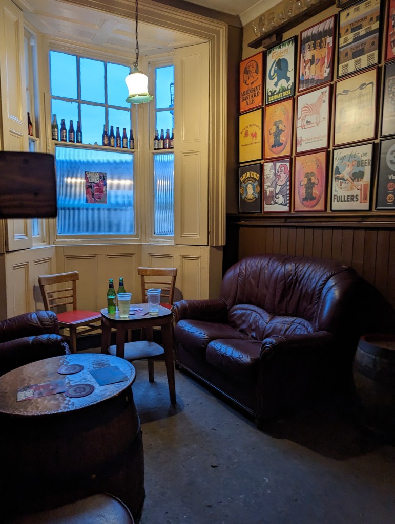 The Cat had live music, but no spare seating, and the act was what you’d call “CAMRA beer festival” so we moved on.