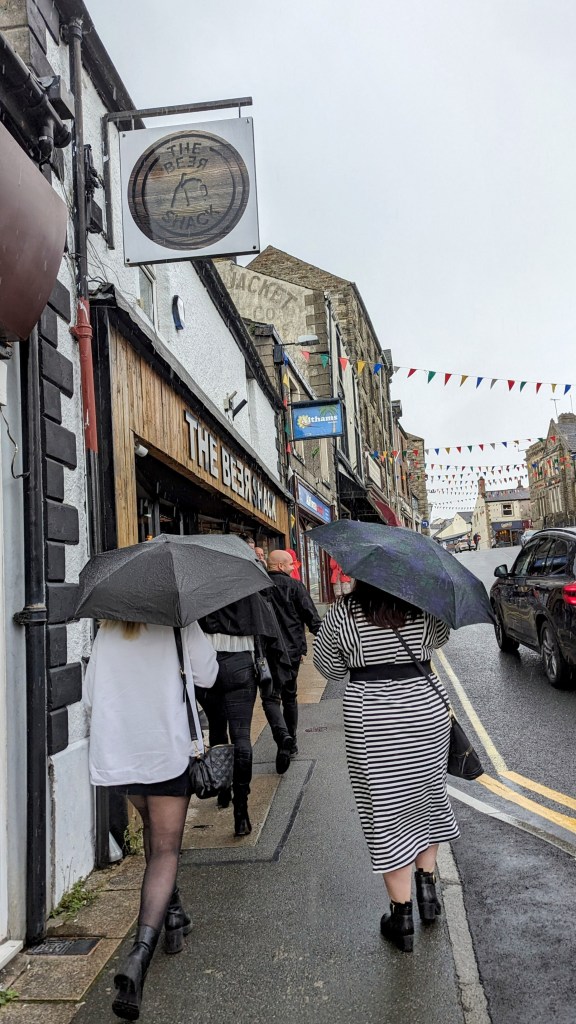 8 minutes on the train from Whalley, £3.10 the two of us (v. £8 on the bumpy bus, boo !), and then a downpour on the two minute dash to the Beer Shack.