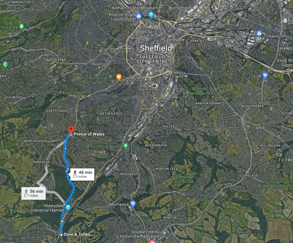 As you’d note from the aerial view, Sheffield is very green, and you can walk 2 miles from the Indian restaurant at Dore station along an unfussy route through Ecclesall woods.
