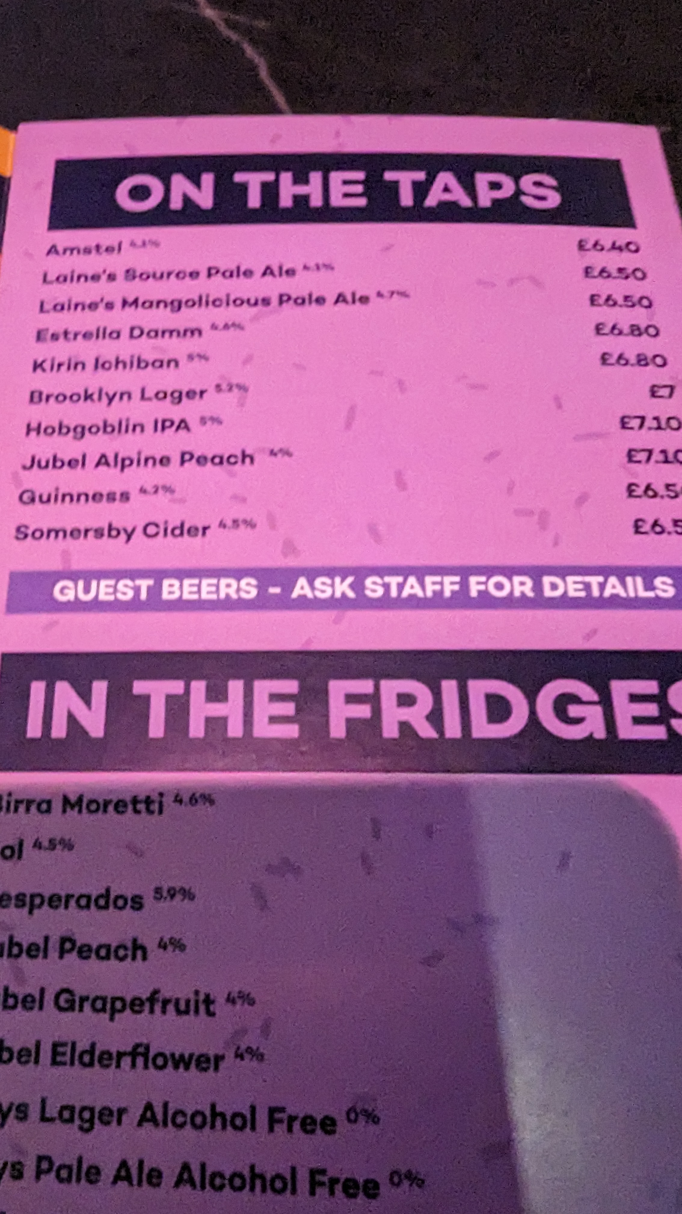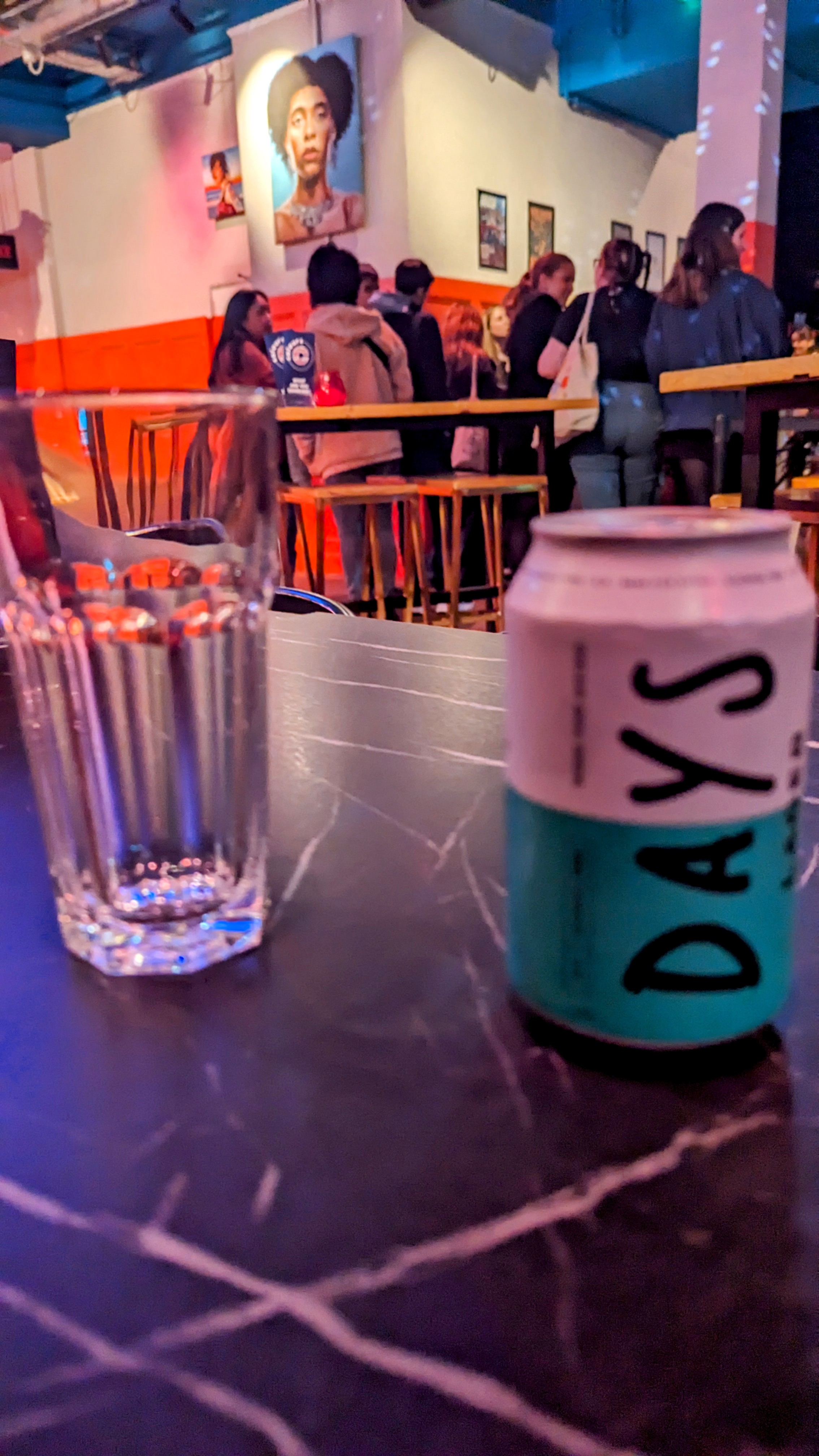 I start with a can of Days Alcohol free lager, immediately realise my mistake inside the music room and ask the (incredibly cheery) barperson to root around in the fridge for a beer. She comes up with this;
