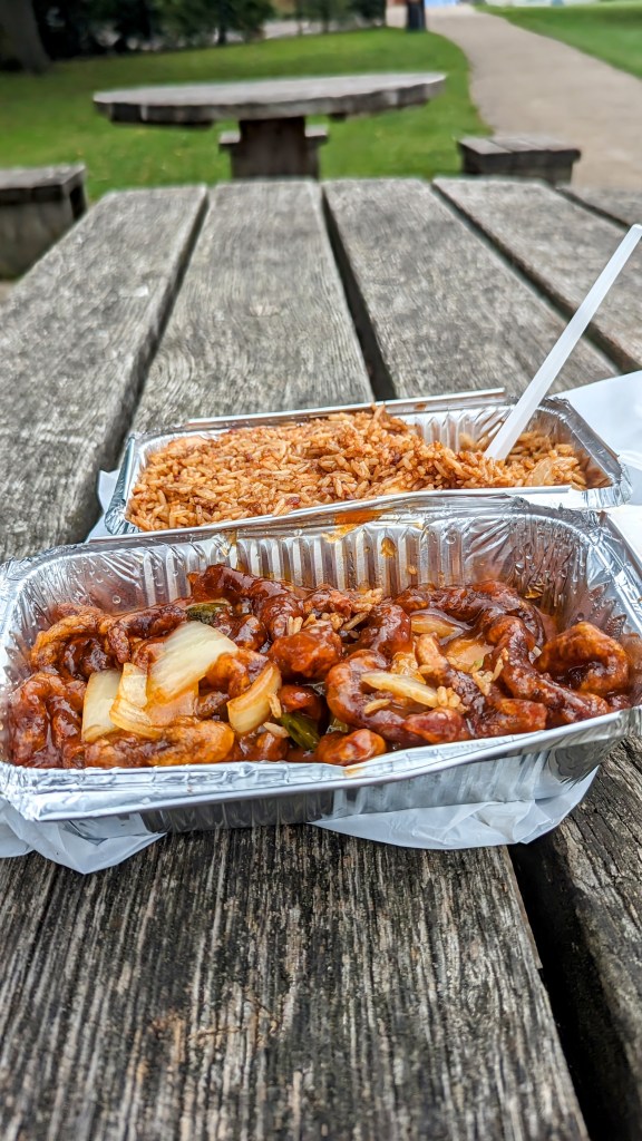 and the bellwether Crispy Beef and Singapore Rice from Chopsticks in Hasland, enjoyed in the rain on a park bench near Chesterfield.