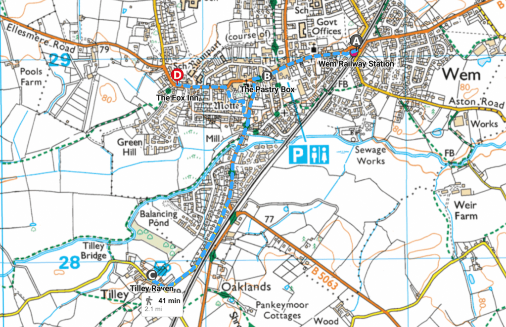 10 minutes back into Wem past the old brewery and a sharp left to the Fox Inn,