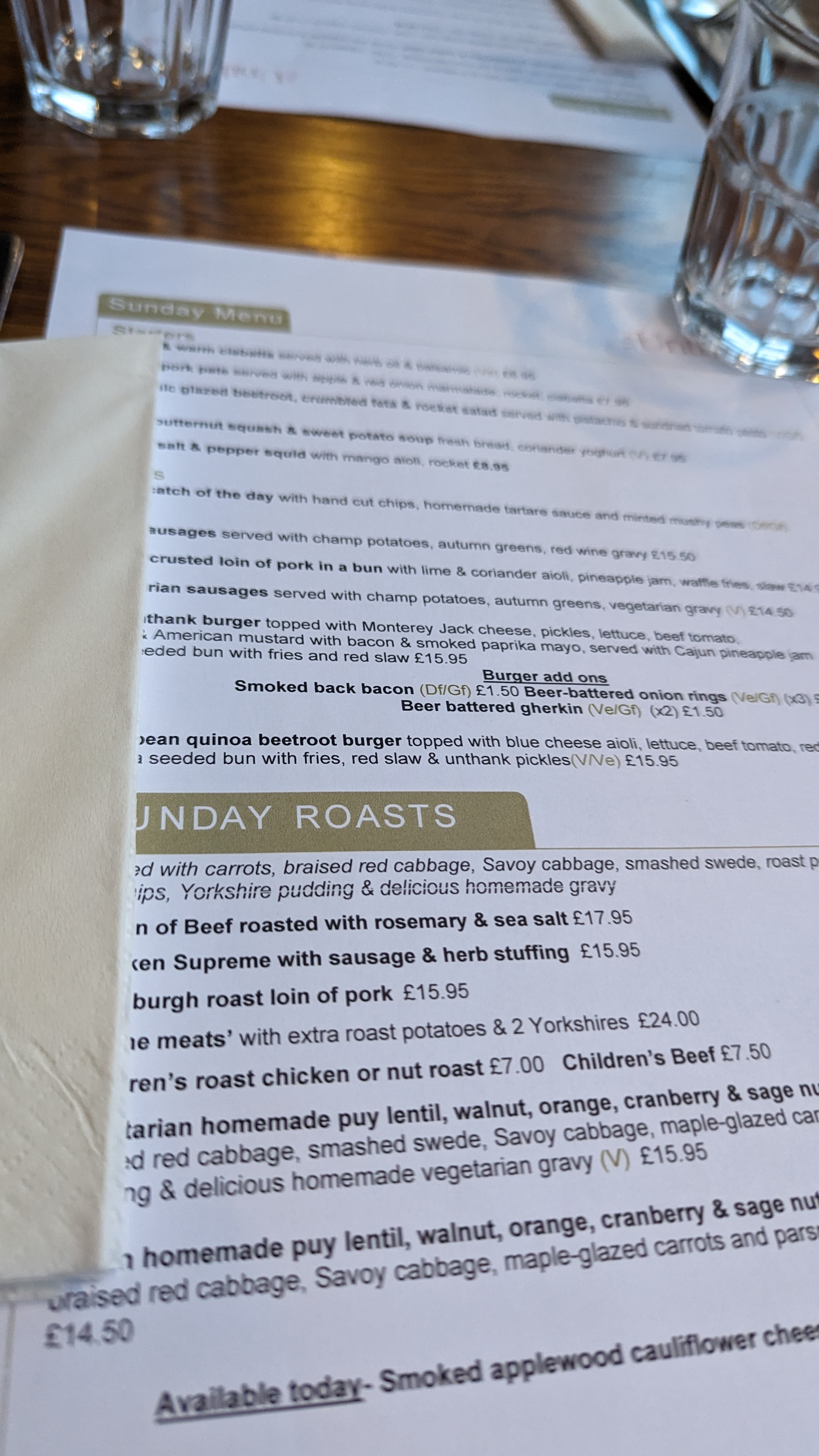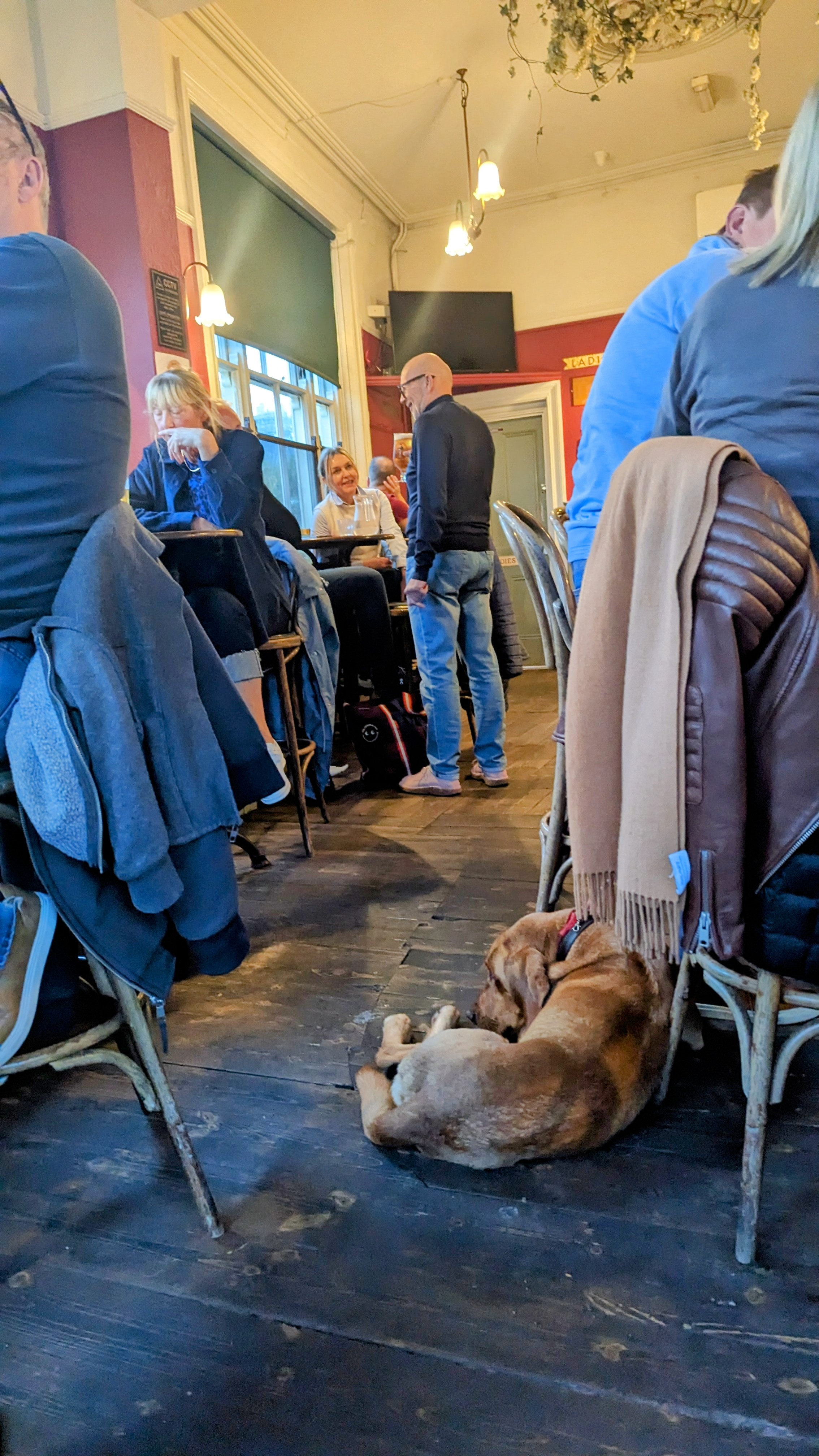 but the wait looks scary, and those homemade pub lentils will have to wait. A lad with a Liverpool shirt comes in from the play area, I almost stand on the dog despite being seated,