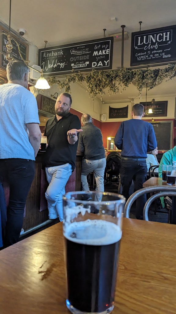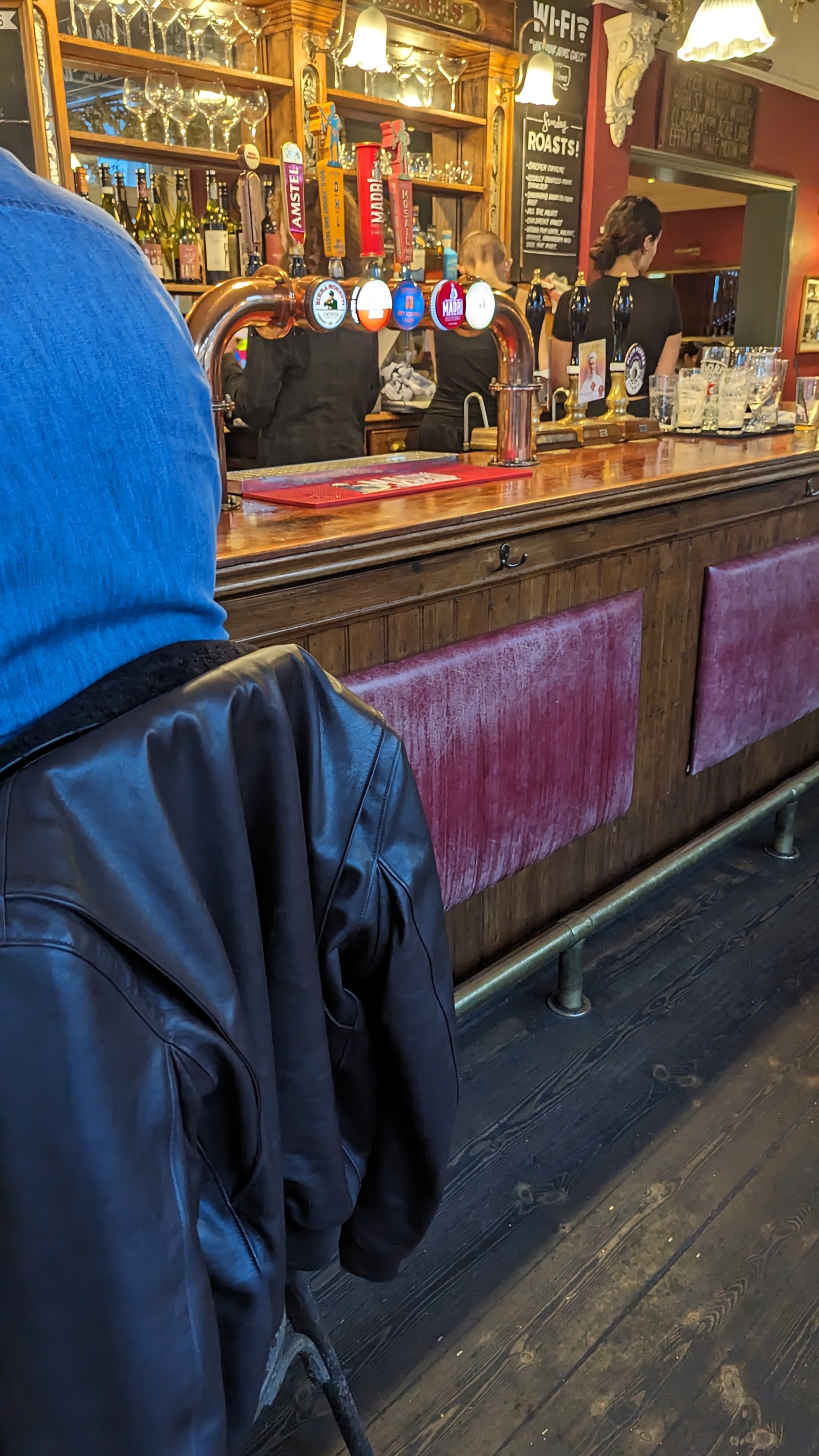 Yet another small corner pub, no room to swing a cat (don’t), let alone let your canine friend lie prostrate at your feet and block all routes.