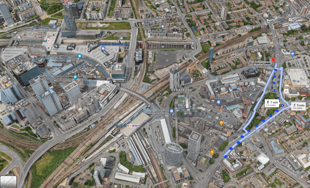 My next pub was in Forest Gate, and I’d thought I’d walk there, reminiscing about my visit to the Goldengrove in September 1997 when I scored the Spitfire a 5.