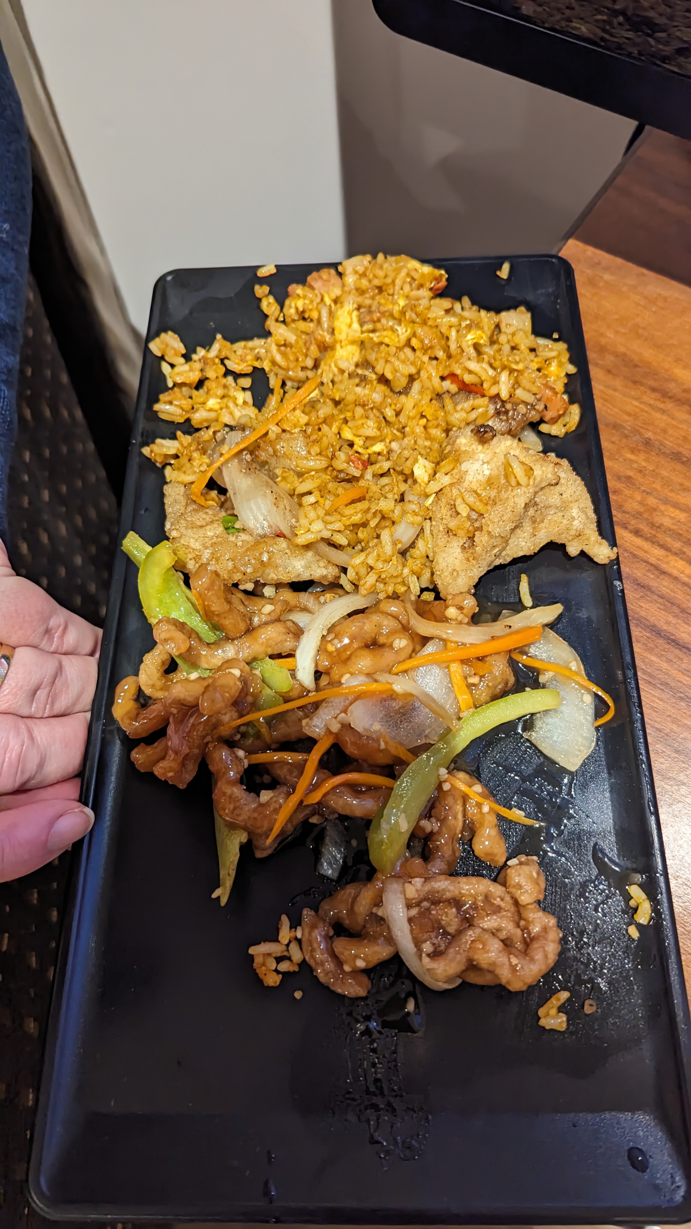 Which isn’t something that could be said about the Crispy Shredded Beef, Salt & Pepper Squid and Singapore Rice, expertly decanted onto one of those plastic plates that hold the cups in the Cave Castle 30 minutes later.