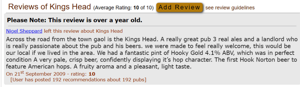 10/10, blimey. Shame the only review is nearly 15 years old. Where’s Sheffield Hatter when you need him.
