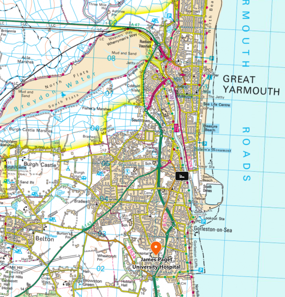 Let’s head east, but not to the obvious honeypots of Great Yarmouth (the Dickensian streets are a joy), but the more workday port of Gorleston, home to the defiantly independent James Paget Hospital.