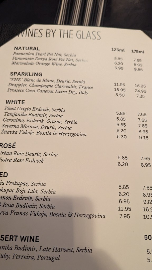 But you can’t come in a wine-led bar and not have wine, especially Serbian Marmalade Orange wine, and it was only a very small (but expensive) glass.