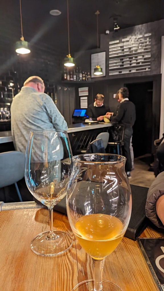 But the damage was done. Ten minutes later we were contemplating “the flight of six hand-picked wines with cheese”, but somehow resisted, though I did start looking at the cans, even as the bar seemed to fill up with blokes improbably drinking murky pints.