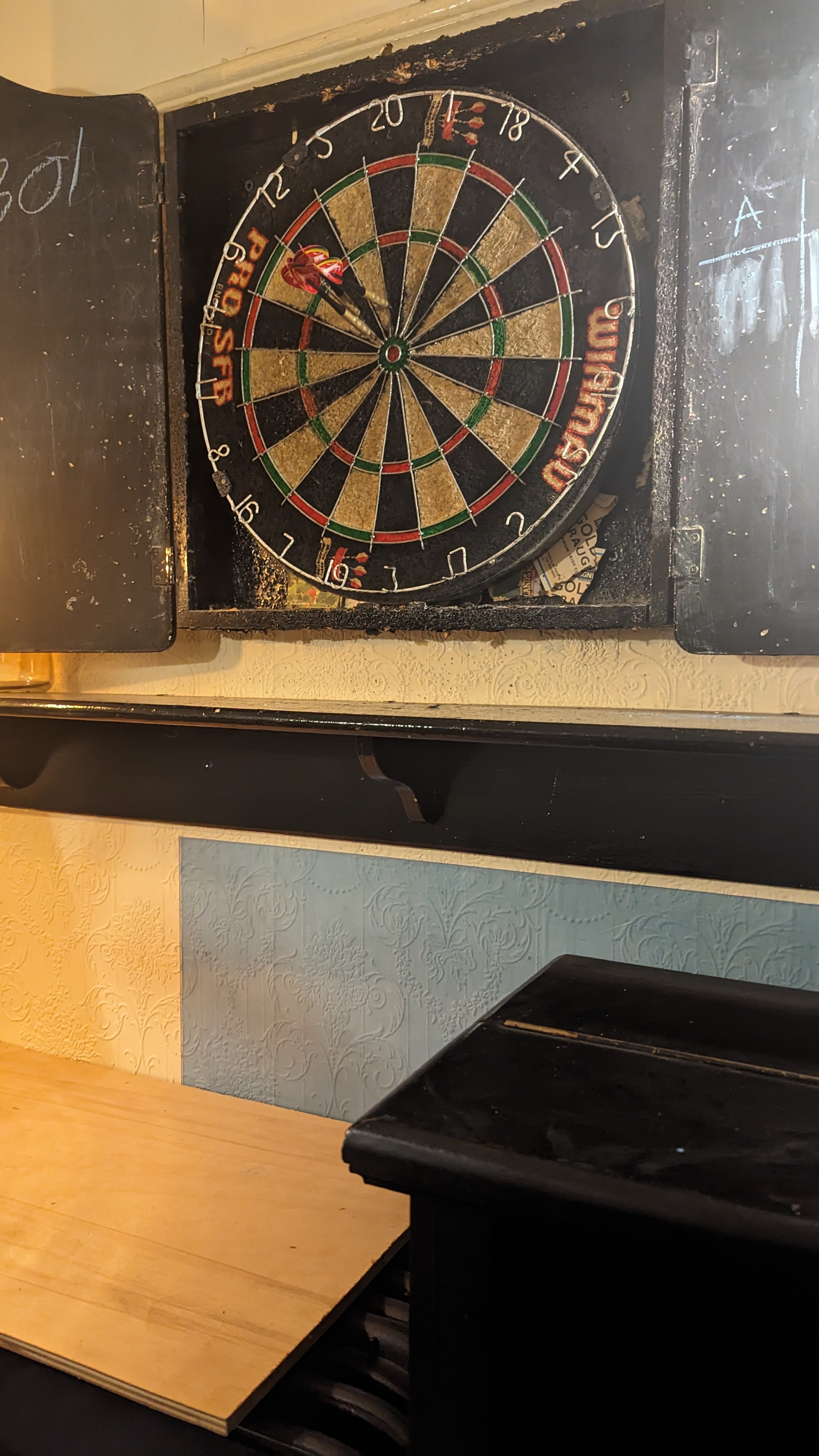and the positioning of the dart board above the piano stool I perched now.