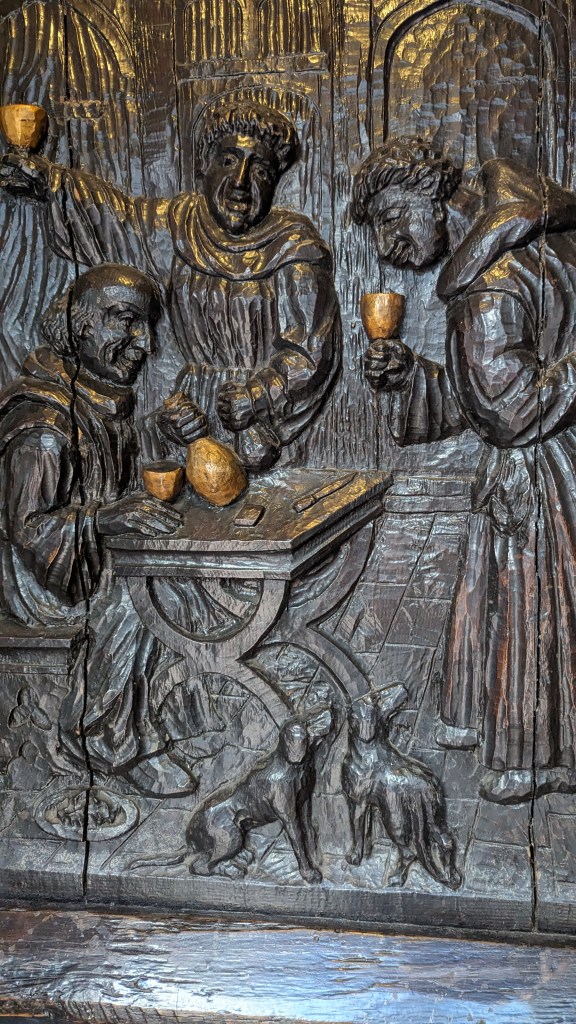 and celebrated carving of a medieval pub ticker carrying the weighty 1401 Good Beer Guide around the (then) town pubs on his shoulders.