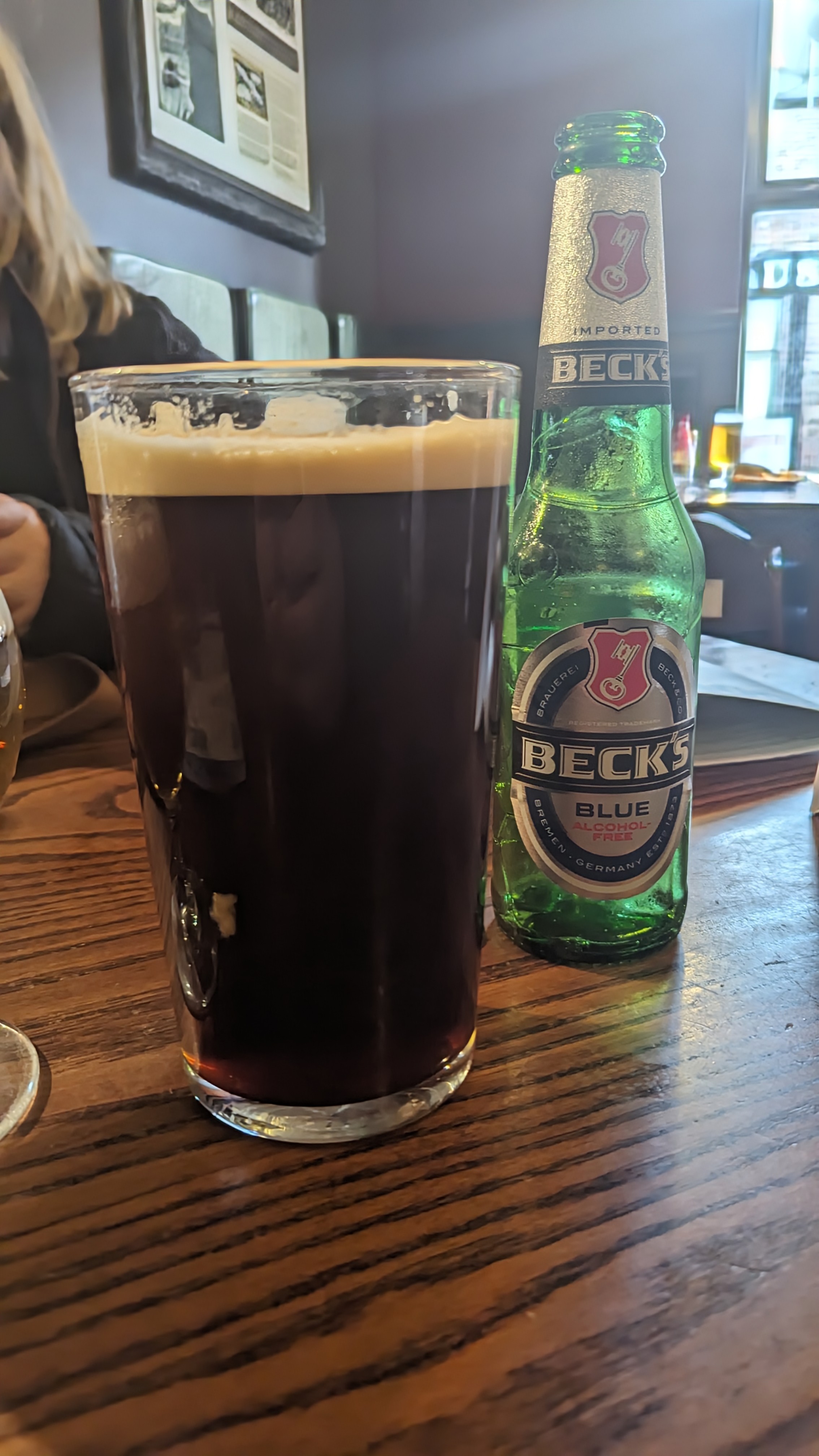 A dull beer range so the Old Peculier (£2.07, oddly) picks itself for Mrs RM while I have a Becks 0.0 which shows the Germans do those N/A things best.
