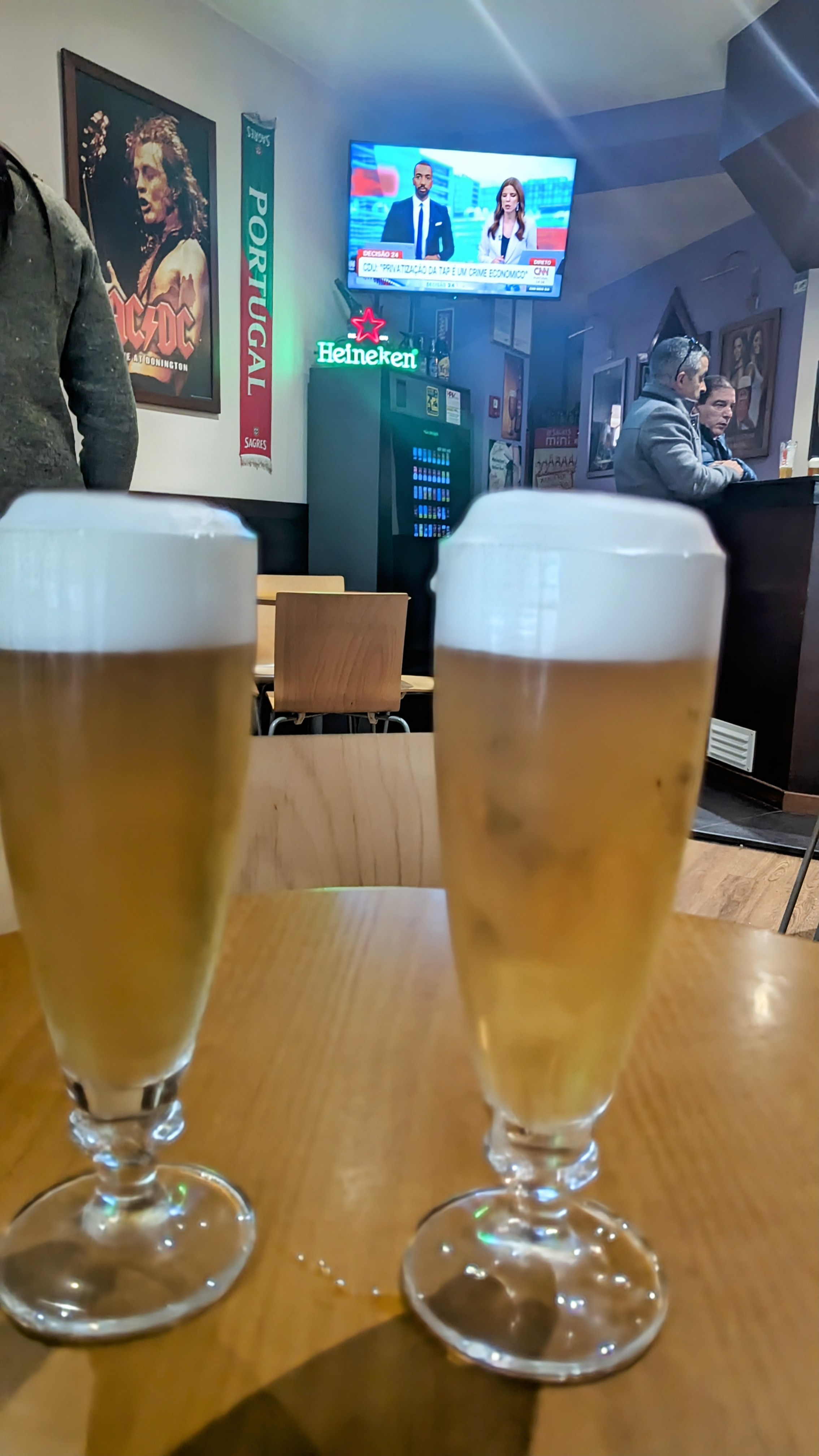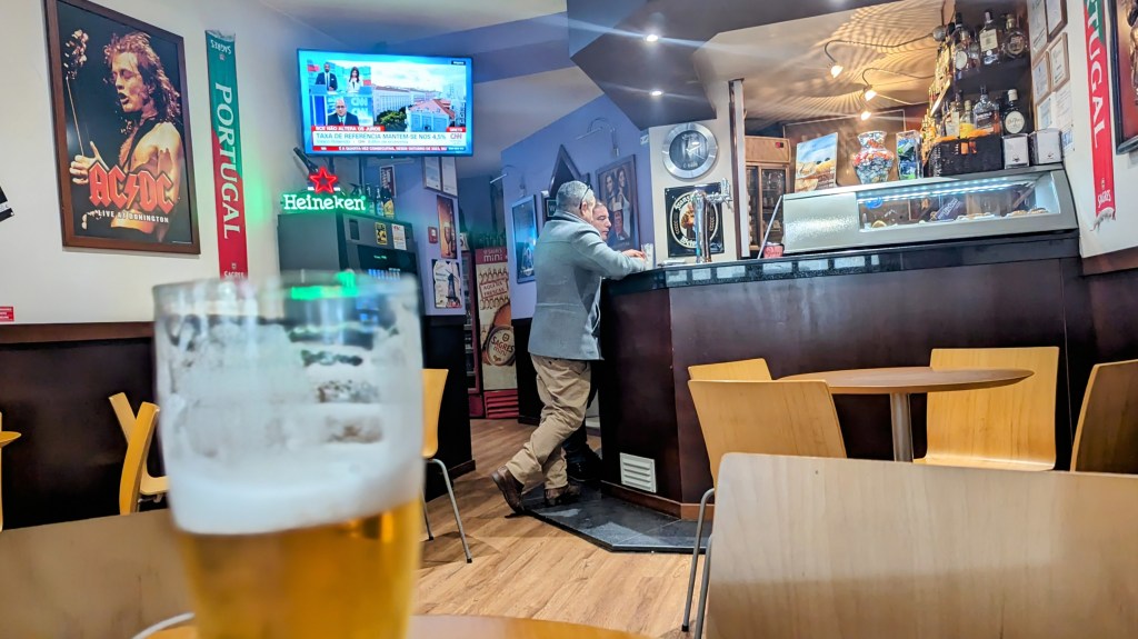 OK, it’s a cafe-bar, selling as many espressos as pints of flat Bass Sagres (the Portuguese Wainwright ?), but it was friendly, had a mixed 2pm crowd, didn’t laugh at my pigeon Portuguese, and seemed incredibly cheap.