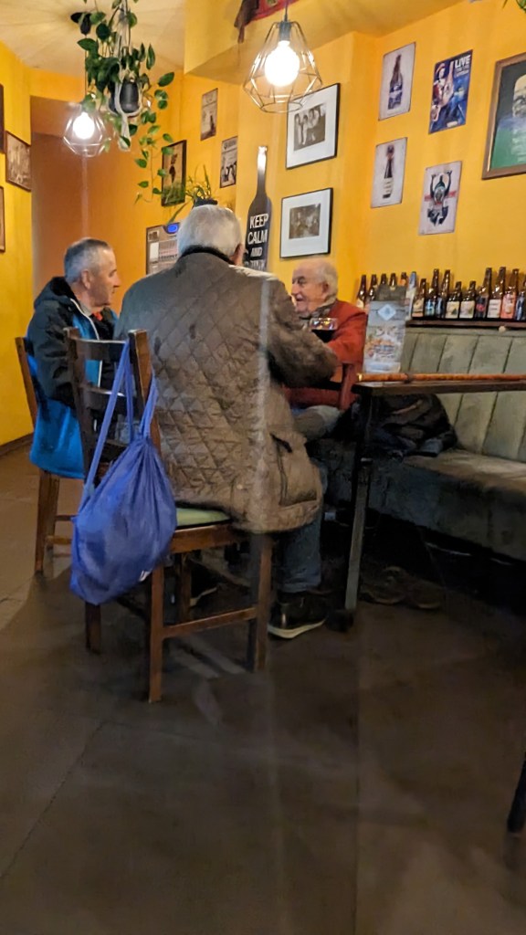 The highlight of our visit is when the old boy with an umbrella switches the TV over to Qarabag v Leverkusen, to the consternation of his buddies.