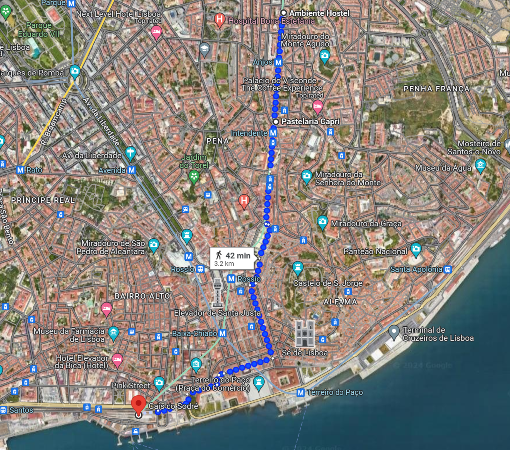 The Ambiente Hostel is £42, less than half what we paid for fading grandeur in Lisbon a quarter of a century ago, and offers unlimited industrial strength coffee and a place to dump our bags till our late, late, flight home.