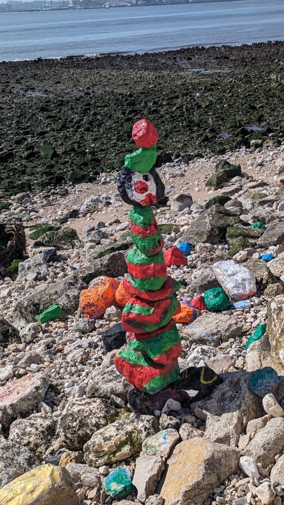An hour later we’d reached the Tagus, with its art installation on the beach, meaning left to the viewer. I think it’s “BRAPA after six pints“.