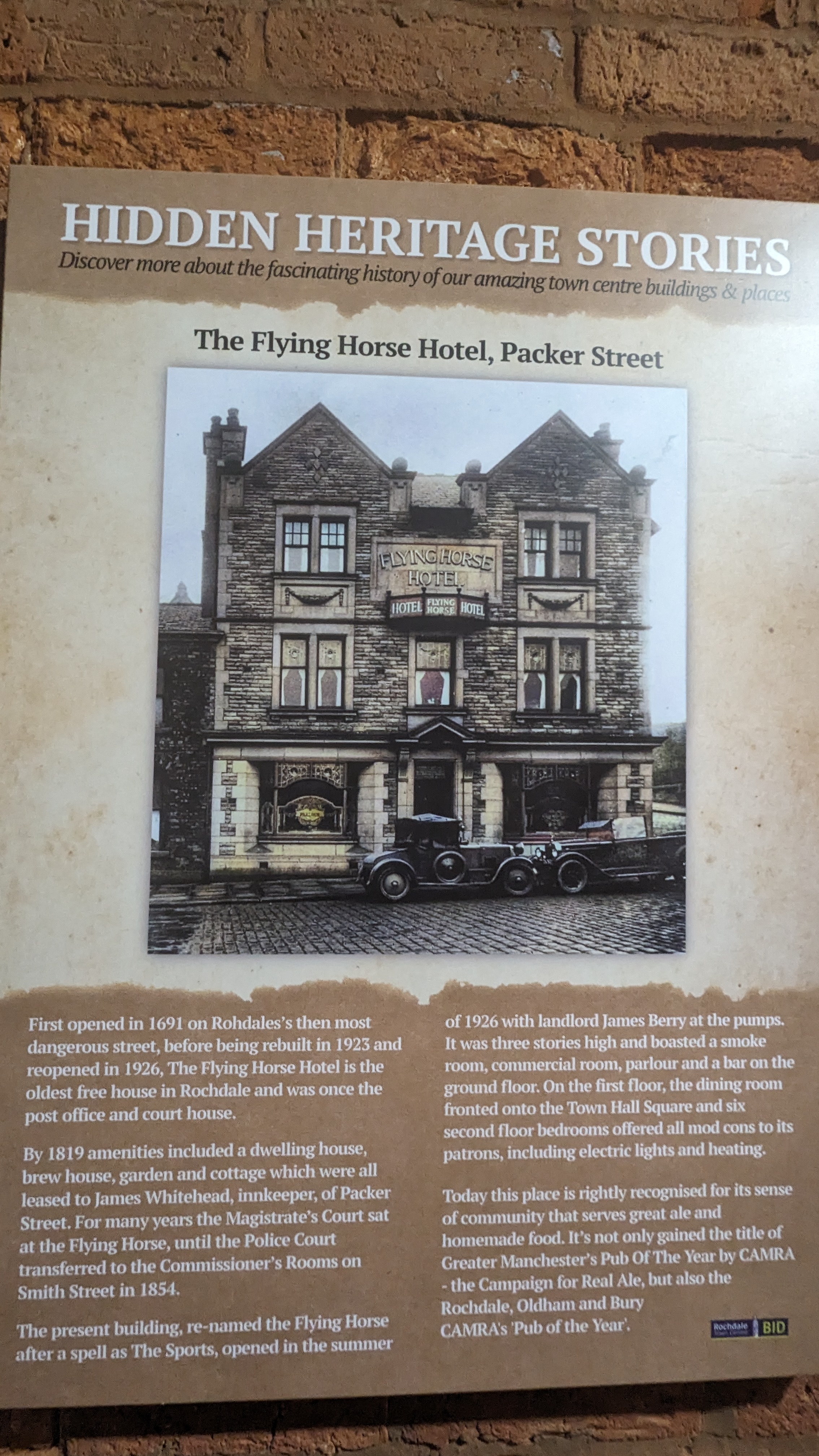 The scaffolding round the Flying Horse mean no hints at all to what lay within, but luckily Rochdale has peppered the town centre with ‘istree and ‘eritage.