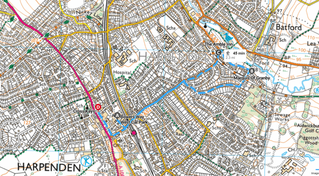 I’d have taken a night in the campervan at Leighton Buzzard, but the prospect of an hour’s walk back from town to Heath & Reach along a canal towpath seemed strangely unappealing to Mrs RM, so I parked up in a council car park in Harpenden, with a promise of a “nice” meal, a “nice” pub and a chance to view some “nice” houses,