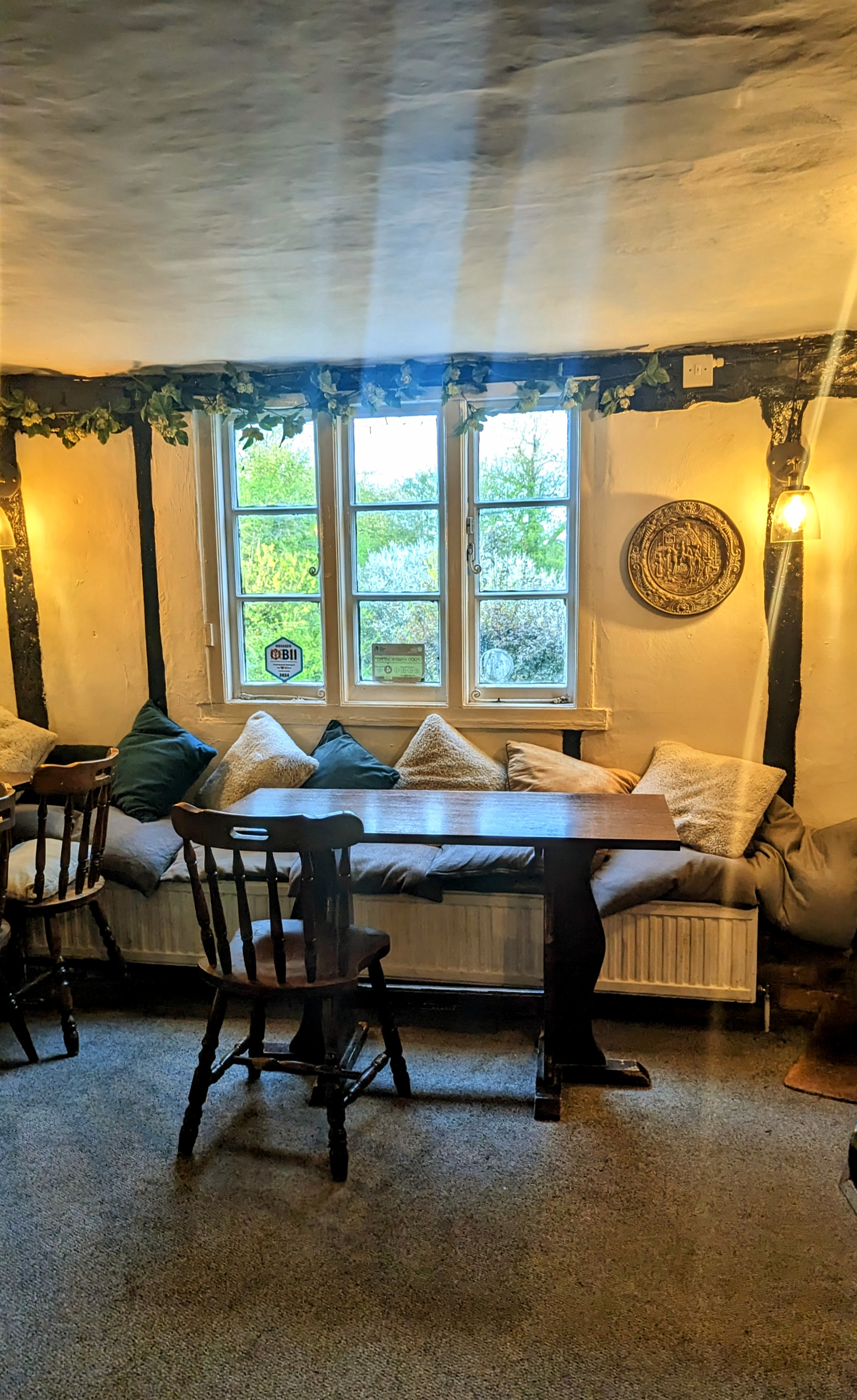 “Your missus has gone that way” said a helpful Old Boy at the bar, and I tracked her down to the room with even more cushions and hops. Cosy and relaxing, despite that cushion overload.