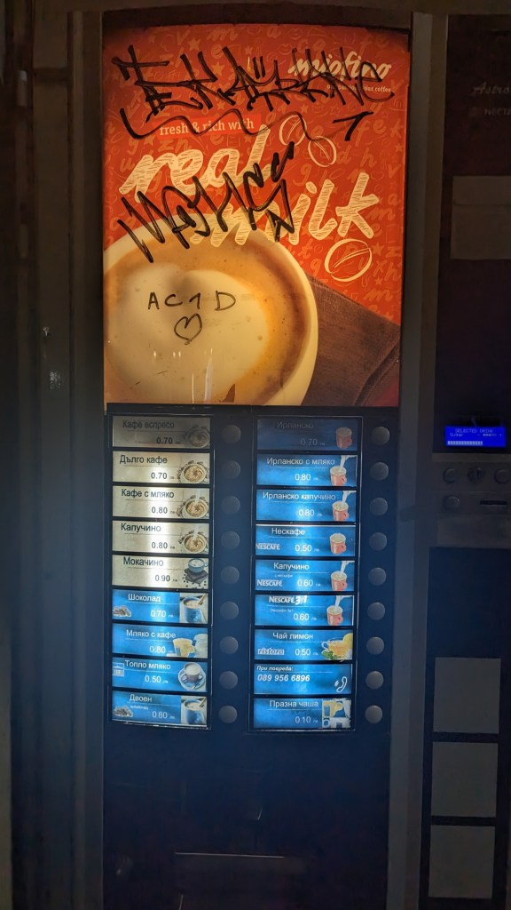 Bulgaria runs on coffee vending machines at 200 yard intervals. This one produced a decent espresso in a cup with plastic stirrer and default sugar for 70 stotinki (30p); I saw it for 0 in Plovdiv.