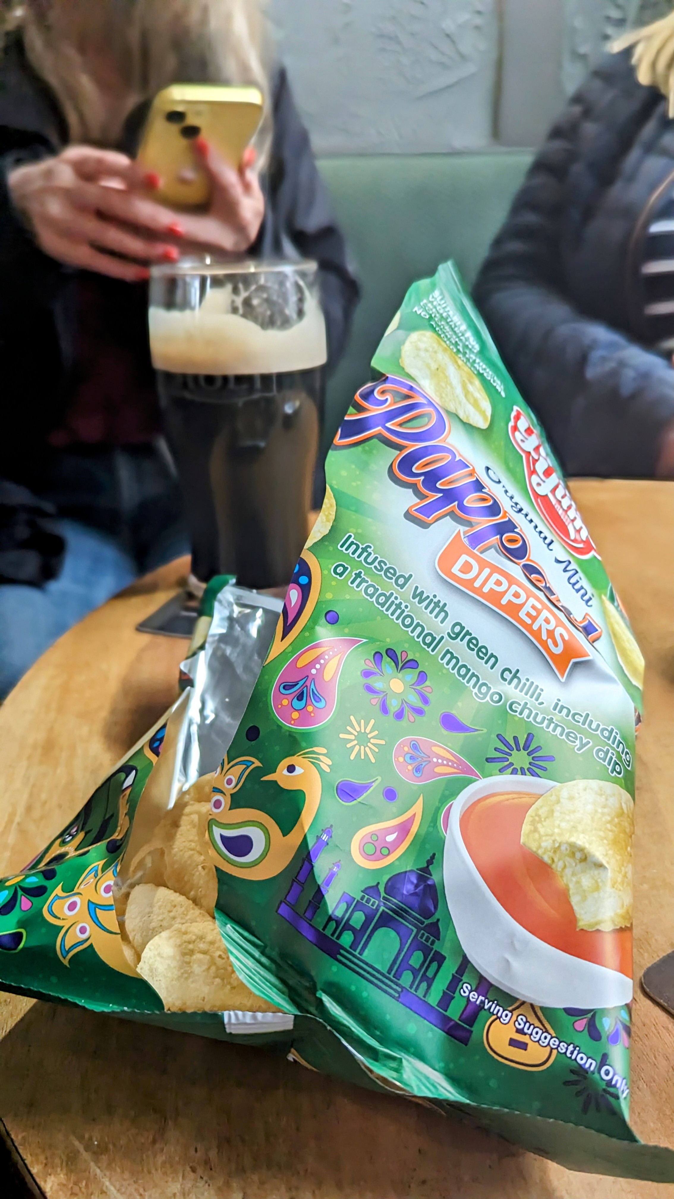 Jane, straight on the pints, had just drained the last of the dark beer, Mrs RM had the pint of Mallinsons, I wimped out with half of Pictish (3.5). Jane and Mrs RM like to drink on a full tummy, I reckon otherwise, so we compromised with a packet of Yummy Yum Pappadoms with chutney dip, the scratchings of the north.