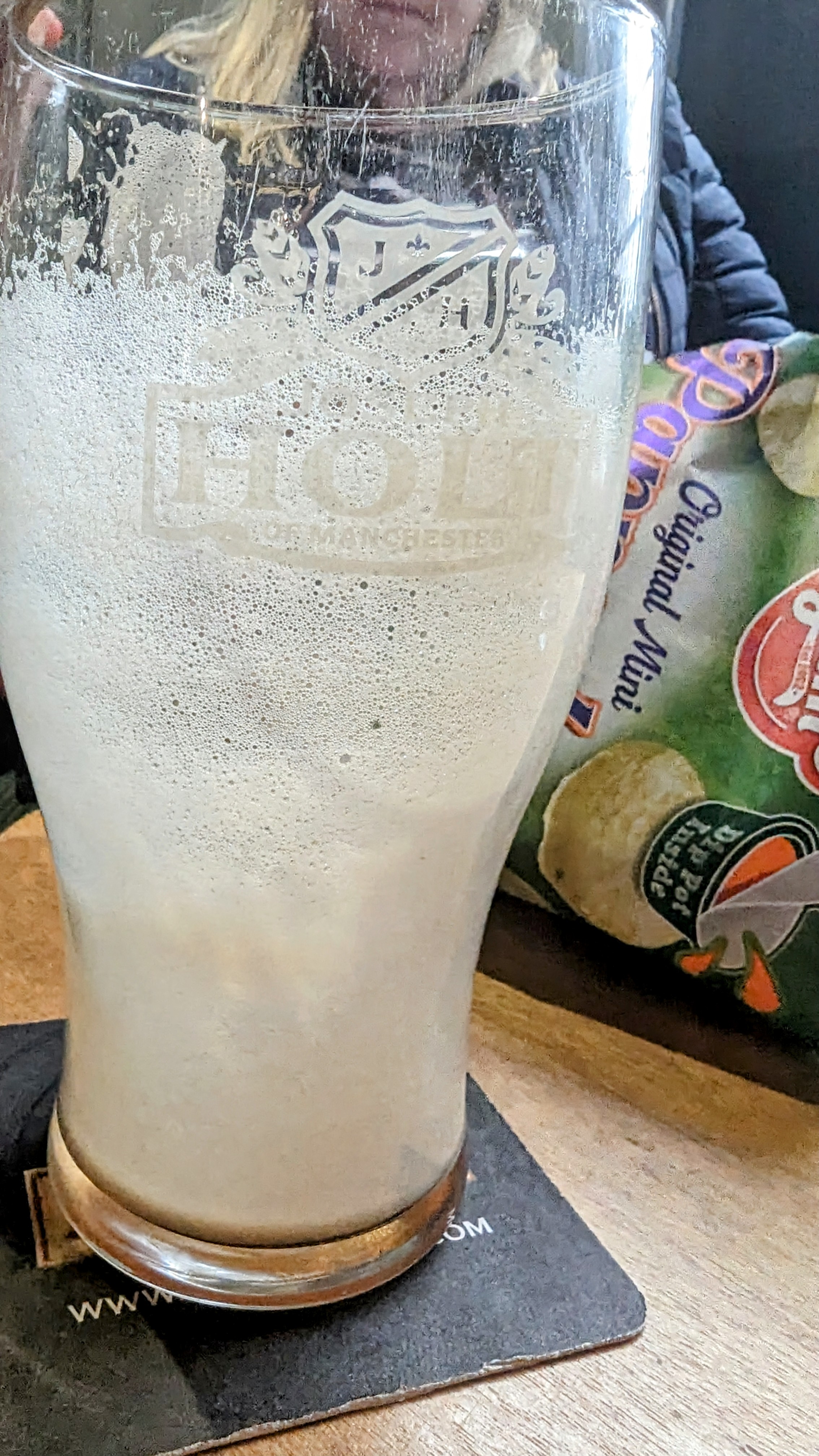 Jane, straight on the pints, had just drained the last of the dark beer, Mrs RM had the pint of Mallinsons, I wimped out with half of Pictish (3.5). Jane and Mrs RM like to drink on a full tummy, I reckon otherwise, so we compromised with a packet of Yummy Yum Pappadoms with chutney dip, the scratchings of the north.