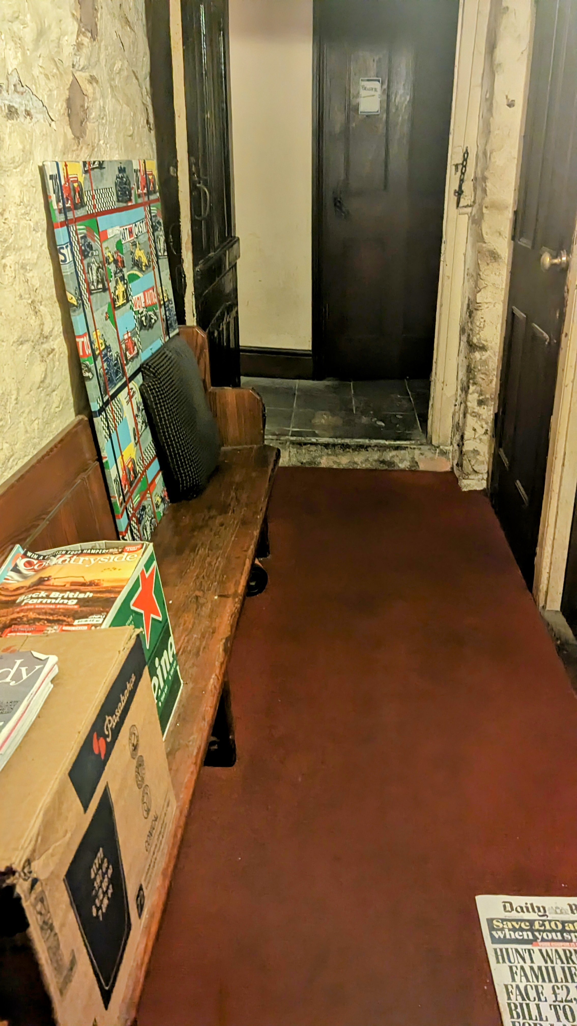 Have I mentioned how cold it was in May ? No life outside, but that golden glow inside draws you in to th passageway splayed with pages of the Daily Mail, lots of rooms marked “Private”,