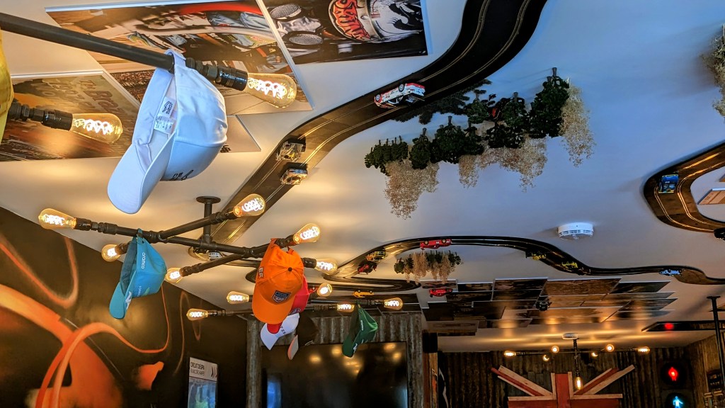 A driving simulator upstairs, racing track on the ceiling, a joy for petrol heads,