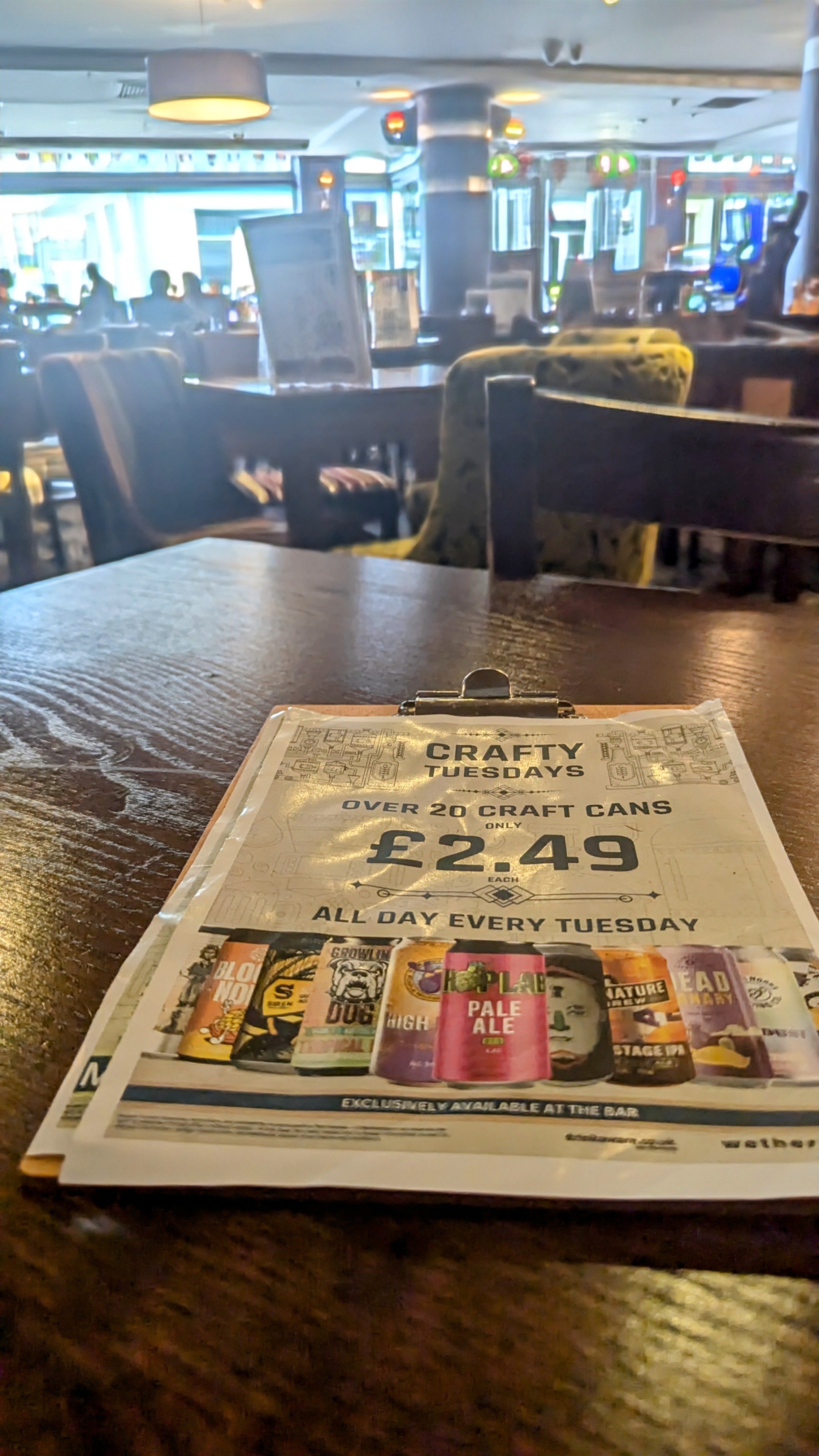 1. That’s an unvisited Spoons I very easily walked past during my 2019 days in Huddersfield. One of my top four pubs there was the Vulcan which opened mid morning.