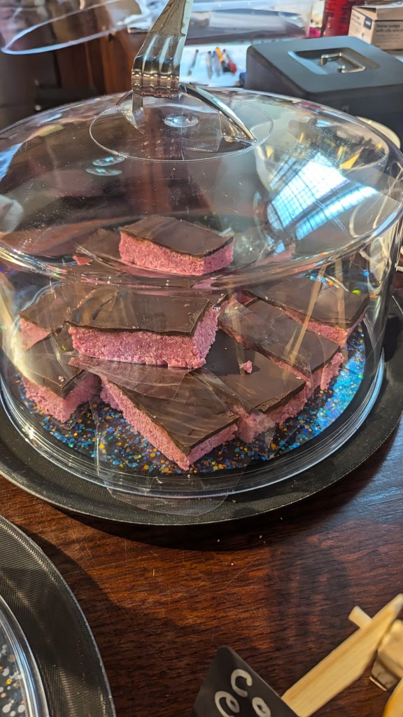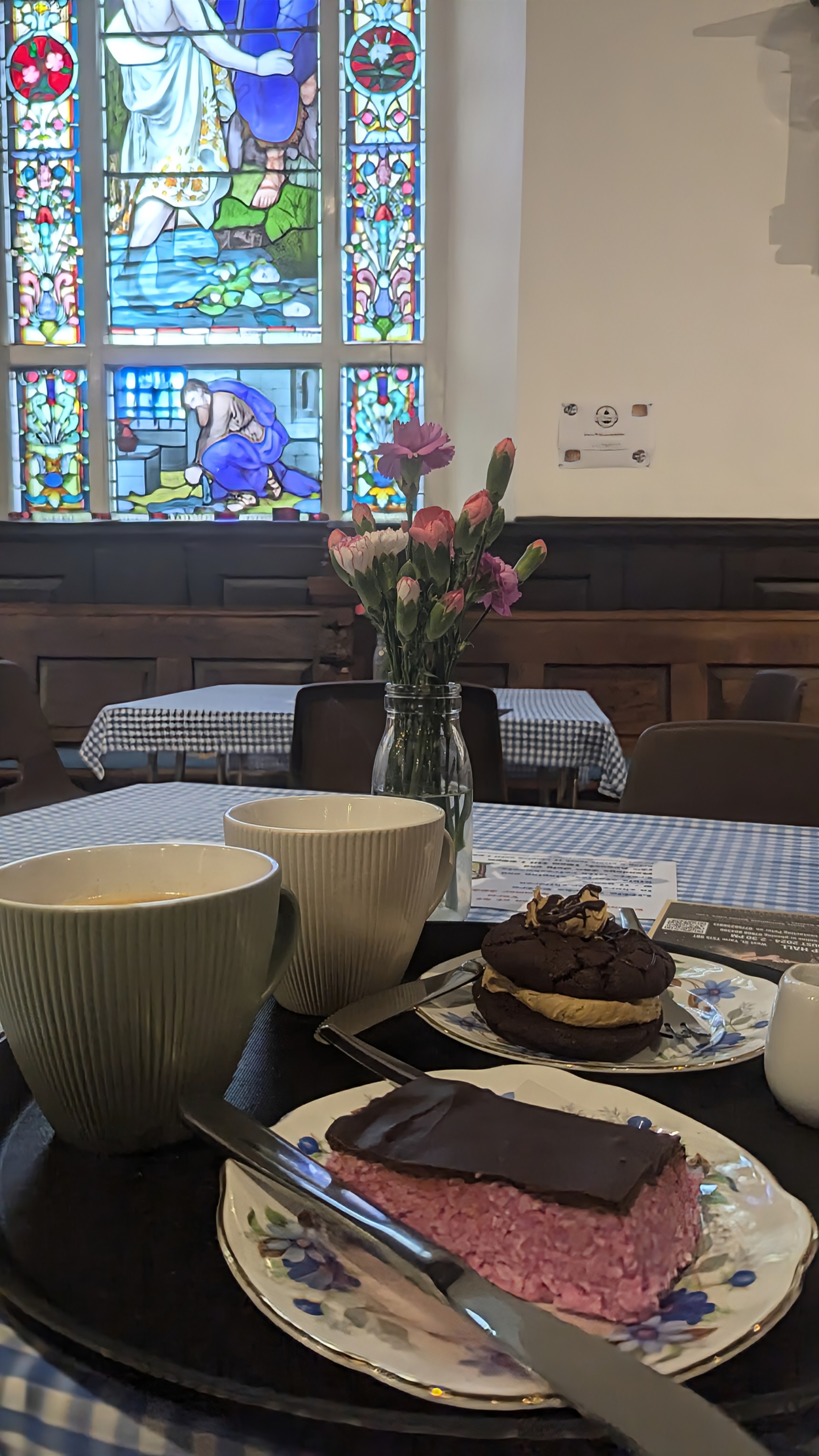 A high class lunchtime coffee stop in the heart of the church, not tucked away in a grim room at the back, with irresistible cakes and proper espresso machine.