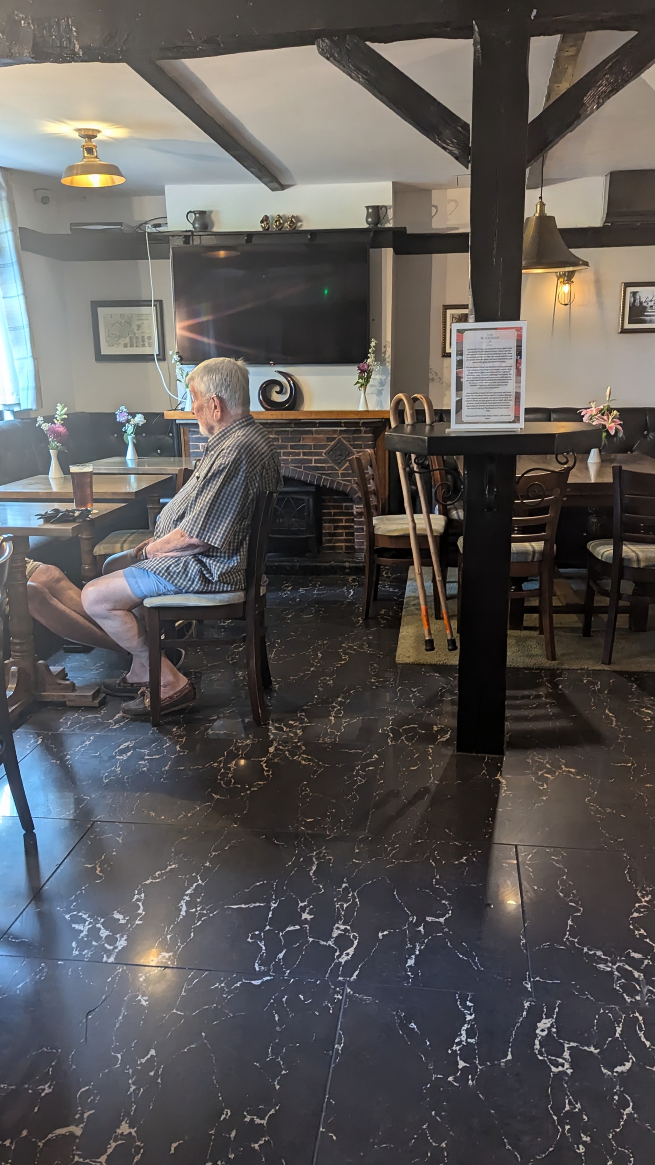 There’s a private function in one room, a garden full of youngsters, leaving just a couple of Old Boys and me under the beams.