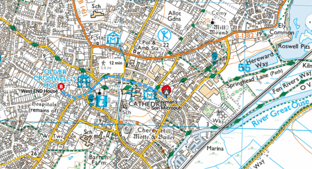 A Cromwell (occasional brandy drinker) pub crawl is a bit unlikely, but on our second night in an Ely car park we walked from his house out west,
