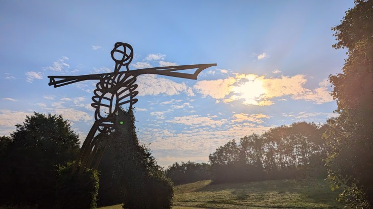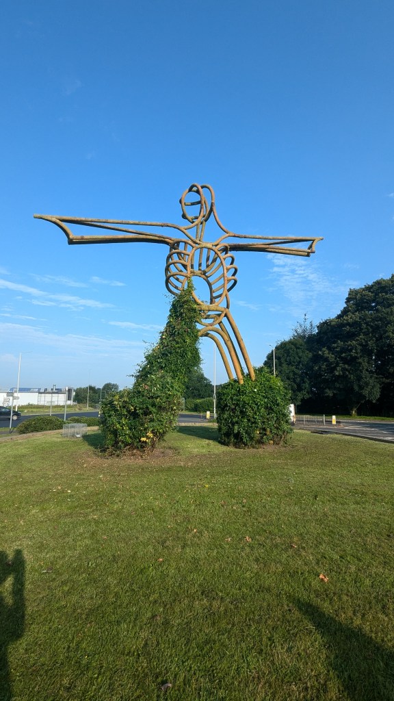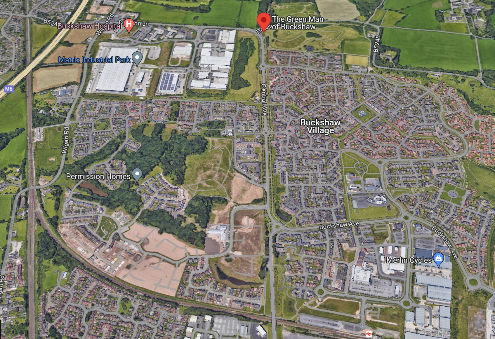 A helpful info board takes you on an hour’s stroll around Buckshaw’s mild attractions, starting with a Green Man (top) that you’d miss from the B5248 towards Leyland,
