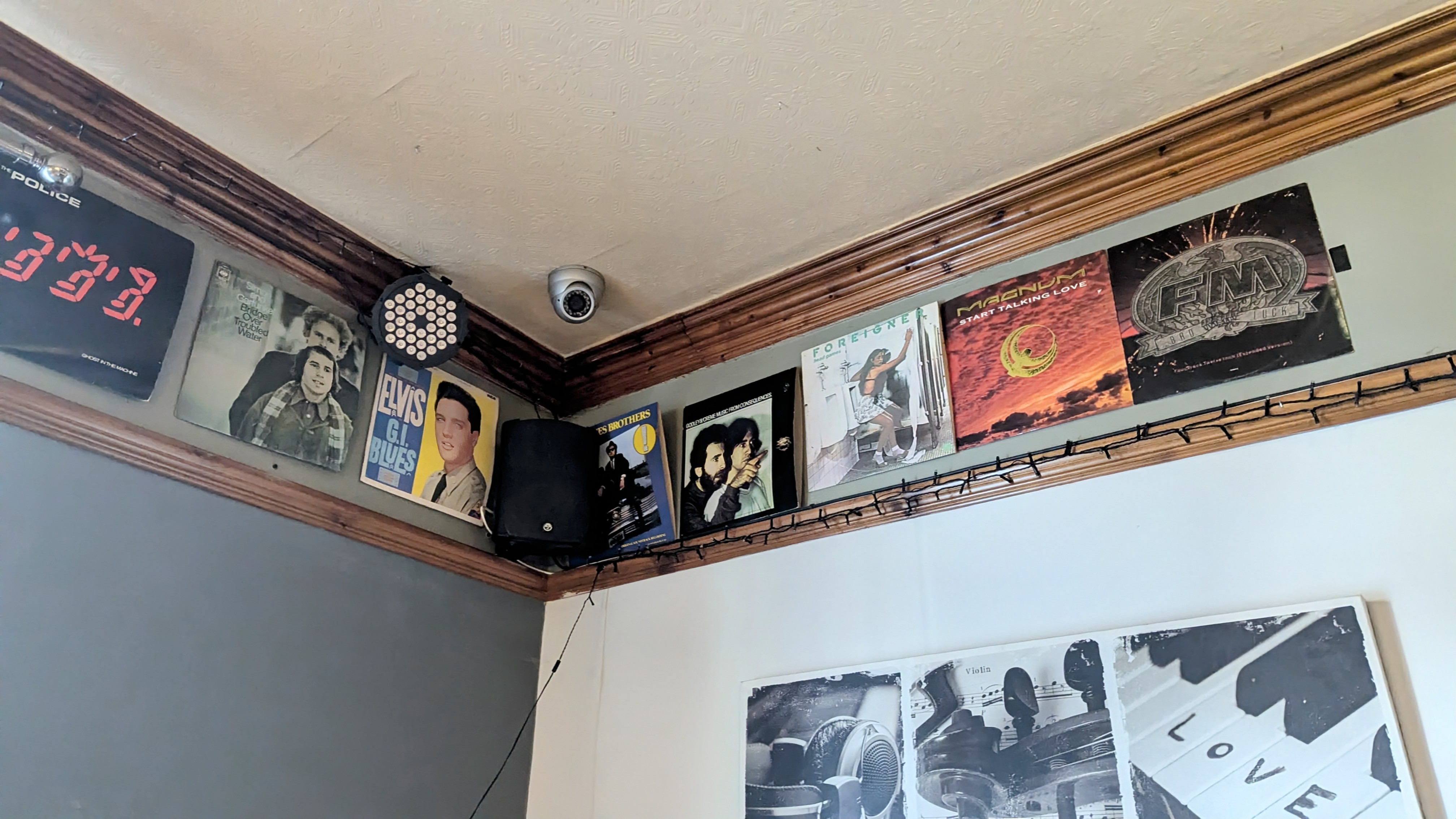 But it’s the music that’s the winner. A collection of classic LP covers on every wall,
