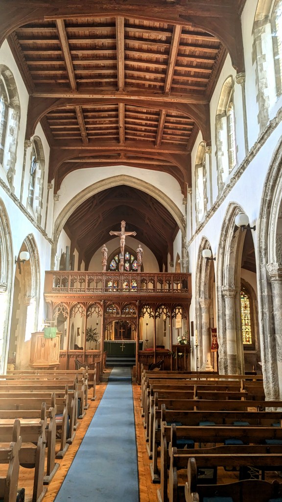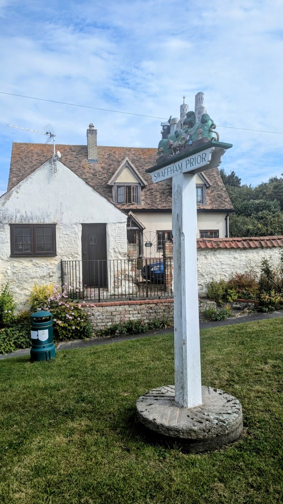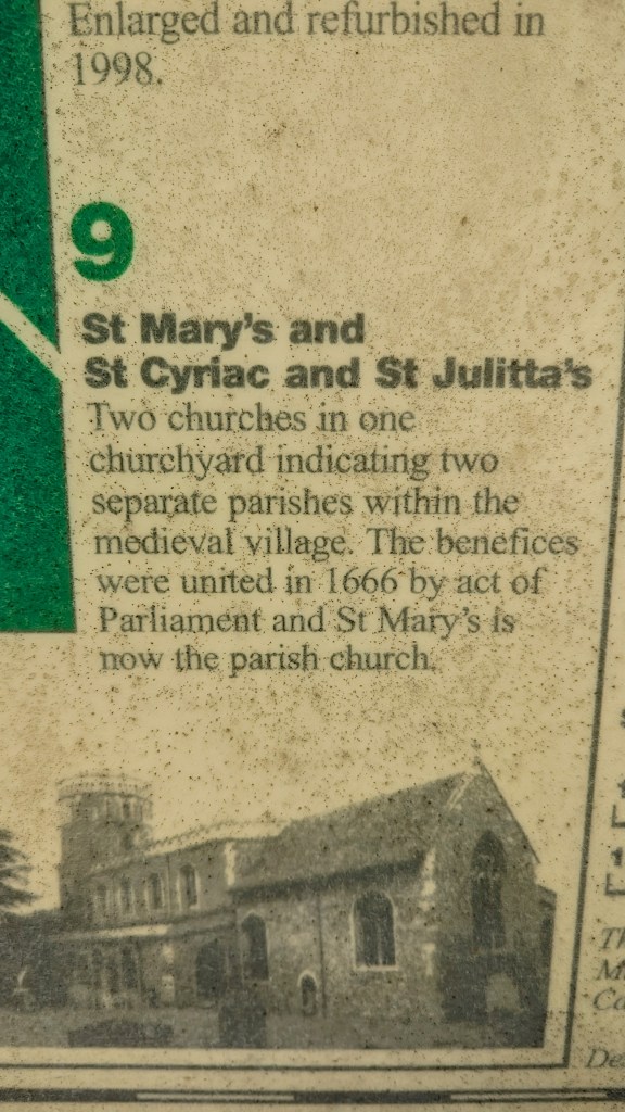 Yes, the village sign showing almost as much wear and tear as SS Cyriac and Julia’s, the deserted (but more appealing) half of the church pair.
