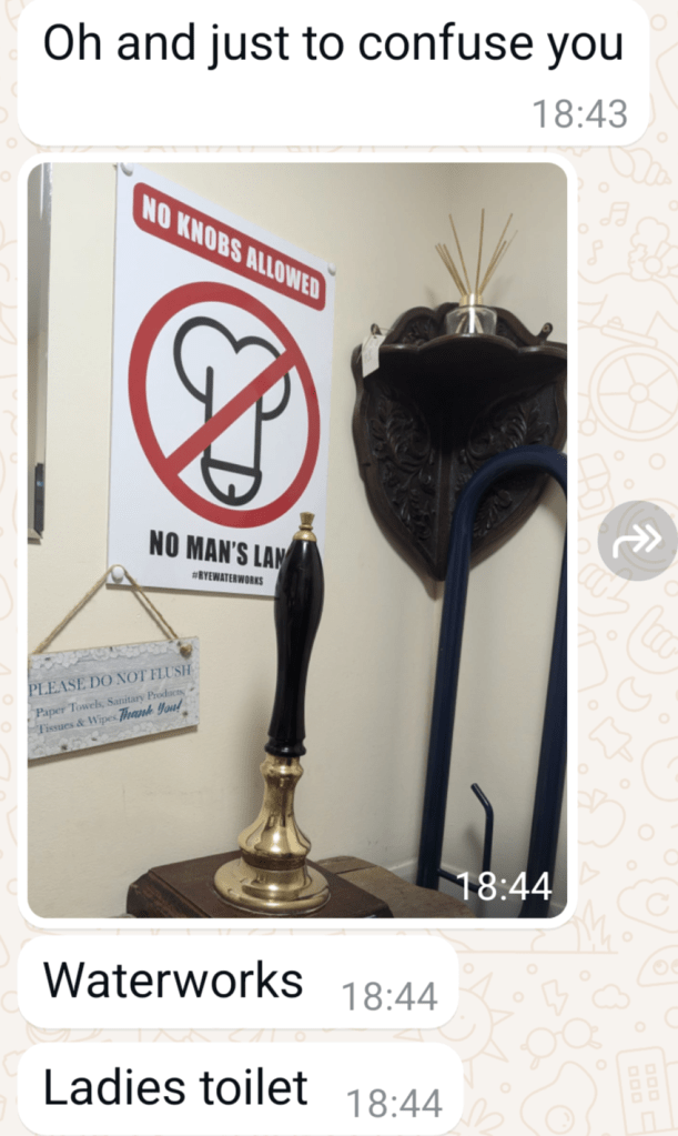As a “woman”, Mrs RM gets to go in the ladies of the Waterworks micro, and capture this gem.