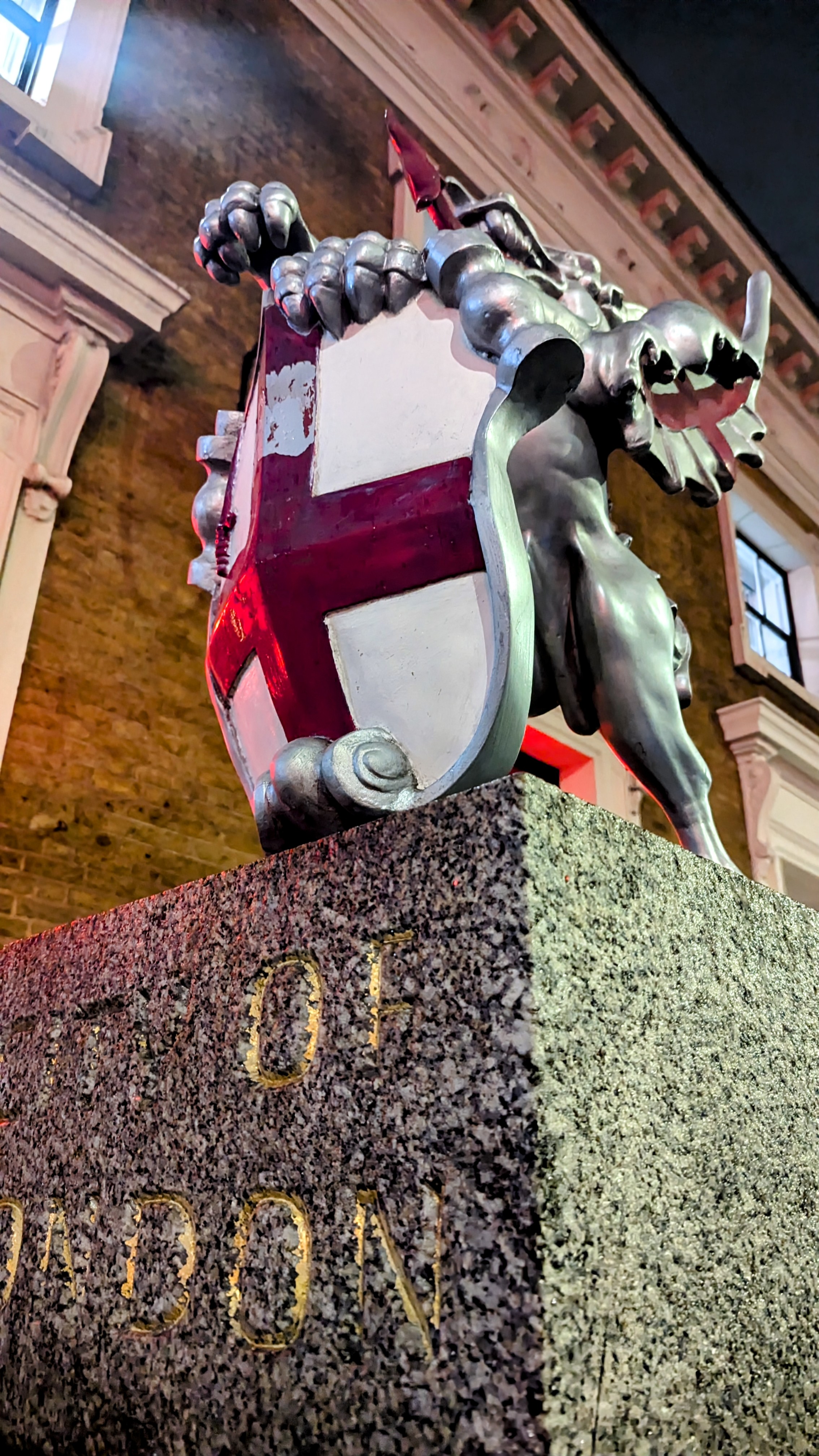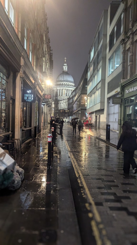 Actually, I am getting soaked now, and make a first visit in a decade to Boots at Cannon Street. £20 for a lightweight model that then seems unwilling to open, which is why the photo of the Bell is so blurred.