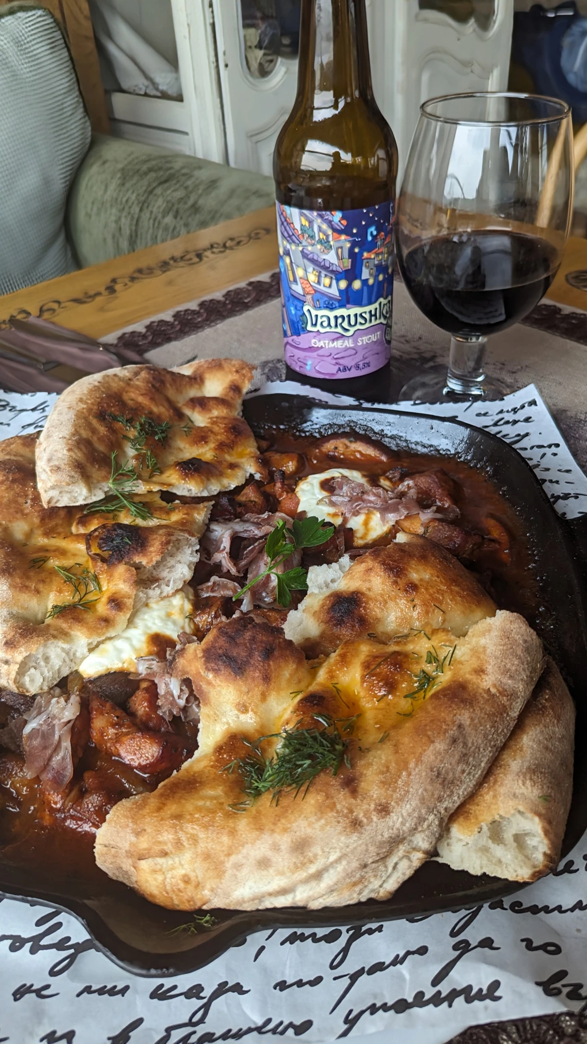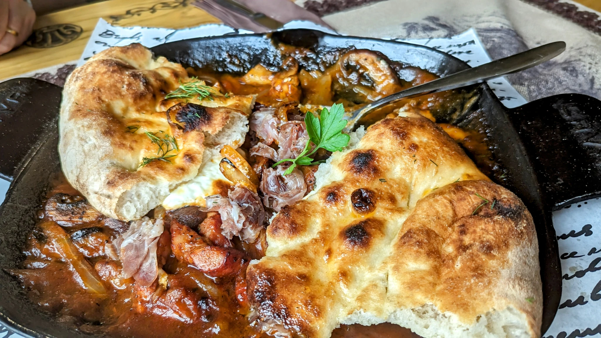 One of several astonishing meals in Bulgaria, this great stew of homemade sausage and pork in a garlic bread mould is the Balkan equivalent of a Parmo in Stockton.