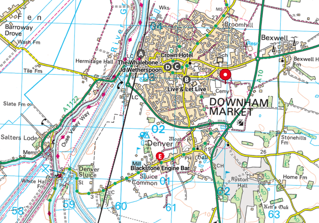 Downham (pop. half a dozen under the 10k) has lost a similar portion of its pubs to Lynn (4 out of 7), but the 3 survivors are solid, and a mile south at Denver Sluice there’s that rarest of creatures, a good homebrew bar.