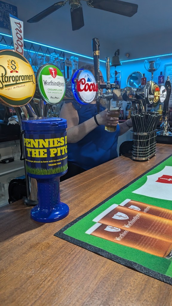 The barmaid disappears to fetch our halves (sorry) of Somerset’s finest, and with kick-off five minutes away we wonder where exactly she’s gone; there’s no working pump to be seen. Wiveliscombe, maybe ?
