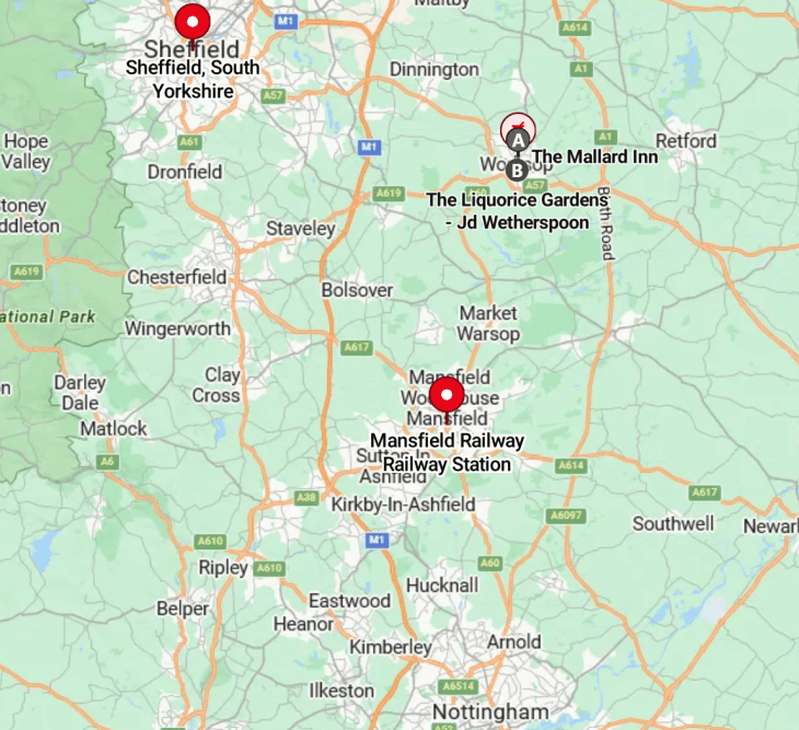 Still a thrill arriving via Worksop at Mansfield’s station; closed by Beeching (why ?), only re-opened in 1995 to coincide with the first of the town’s three (3) Spoons.