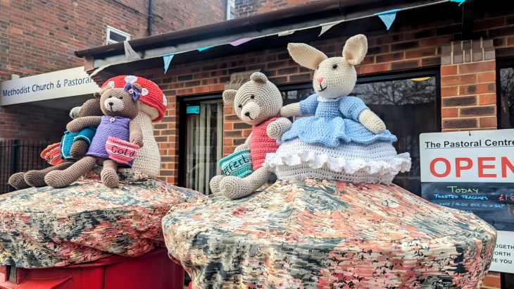 I catch them up at the knitted post box covers,
