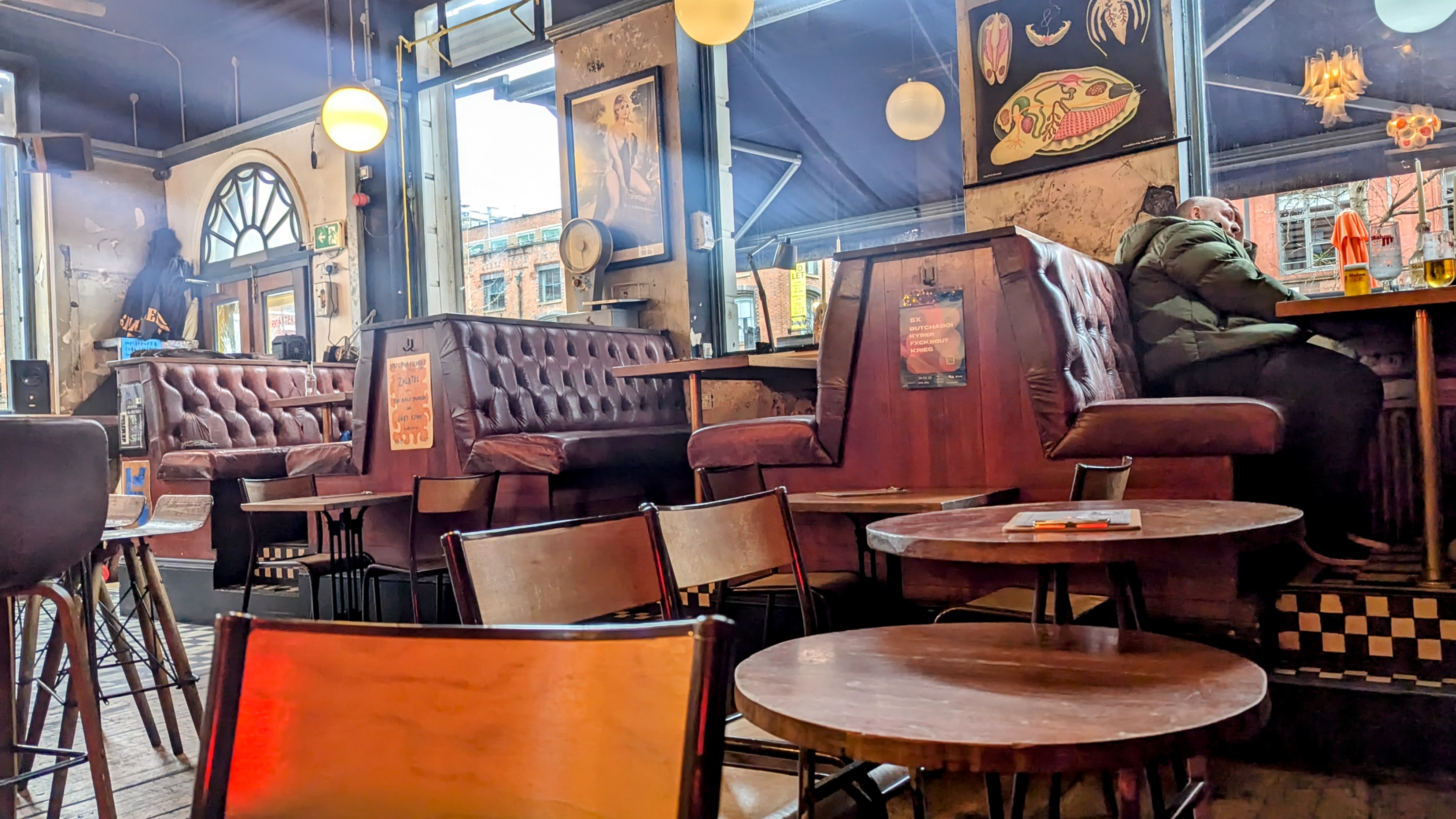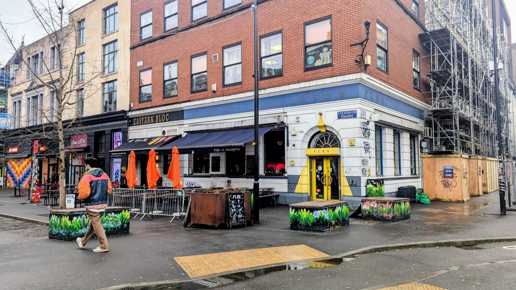 Stevenson Square, barely two minute walk from Matthew’s Piccadilly flat, is the largely pedestrianised run of bar for that comes alive in sun and Summer, but looks a little forlorn on this grey Sunday in February.