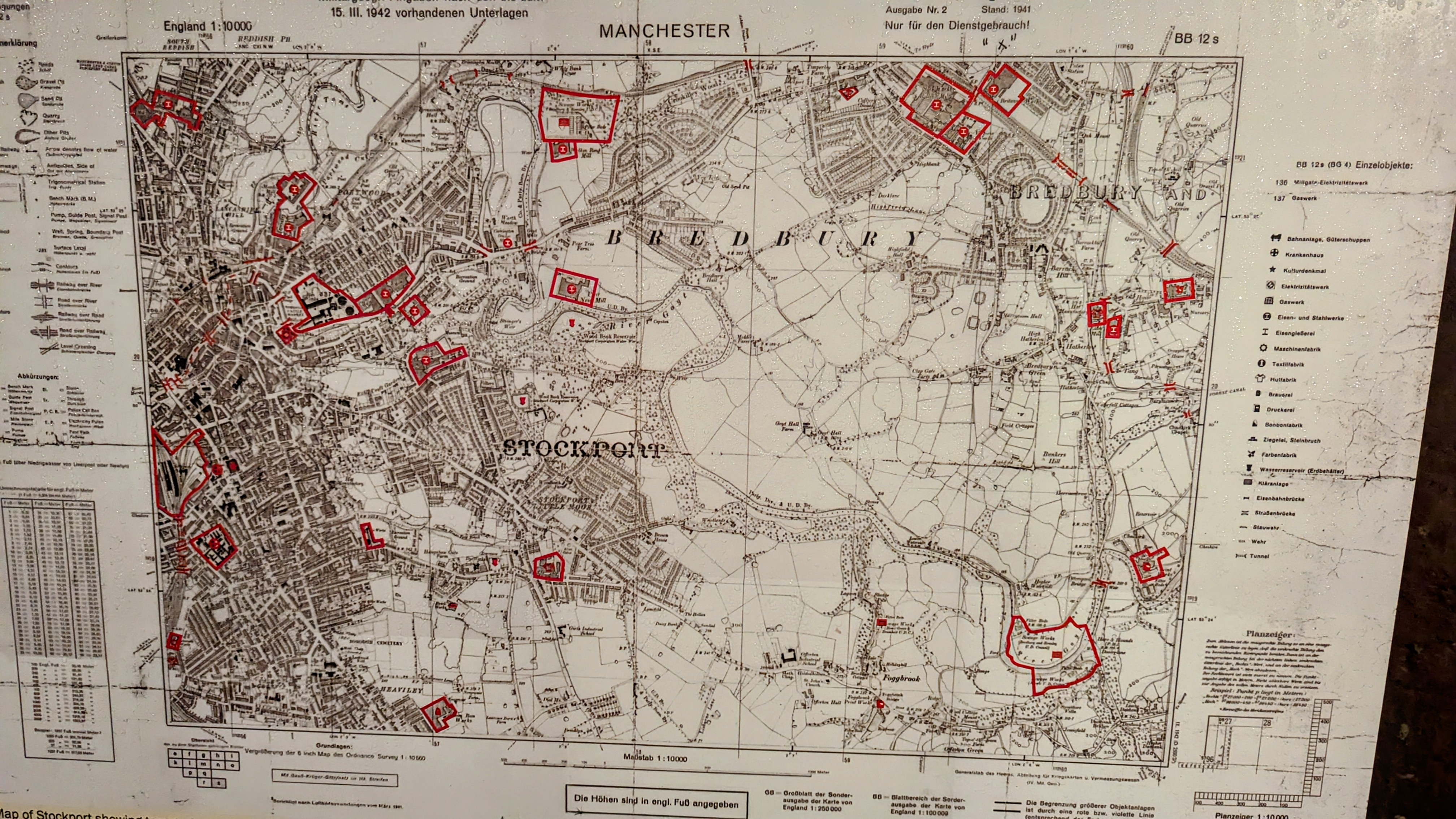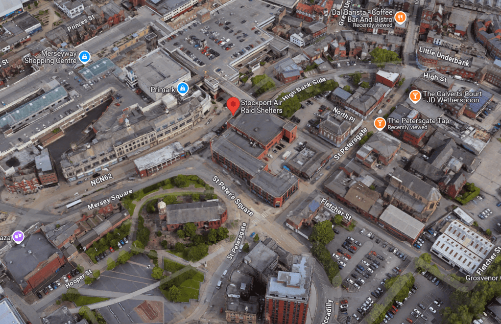 Stockport’s air raid shelters, carved into the sandstone cliffs to protect Stopfordians from air attacks on micropubs (marked in red below) make a fascinating half hour self-guided tour,