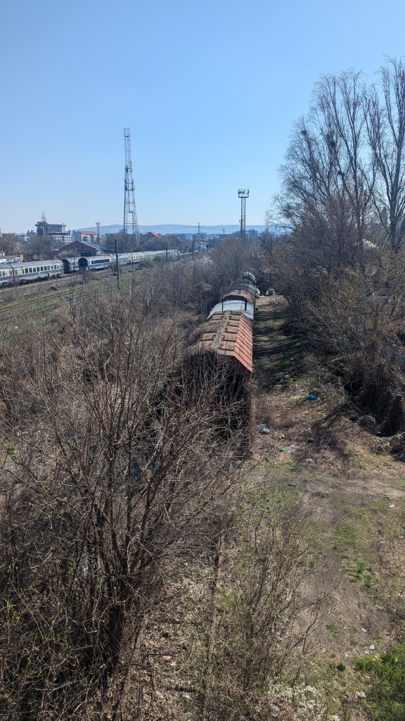 The pedestrian walkway over the almost entirely unused railway lines takes you to the rather busier bus station,
