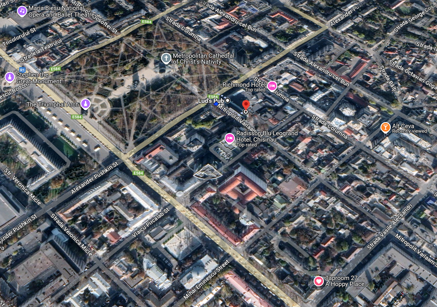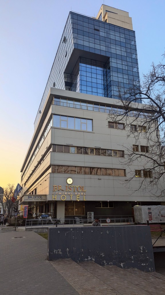Five minutes later we’re sat on a table in Lud’s Pub, looking at a typical chain hotel menu and a view of Chisinau at dusk,