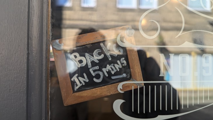 Would it still say “Back in 5 mins” in 5 mins time ? Would he ever come back ?