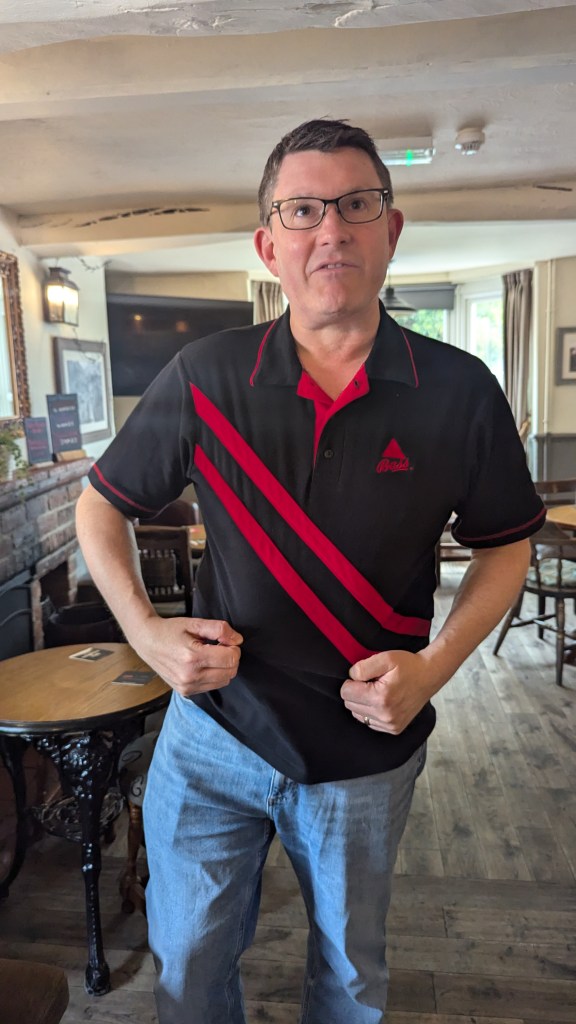 I was wearing my Bass Bath Star shirt, which unlike Quinno’s effort wasn’t  (allegedly) a promotional bribe from a nasty national (boo). I’m sure Manchester City had an away shirt like that 40 years ago.