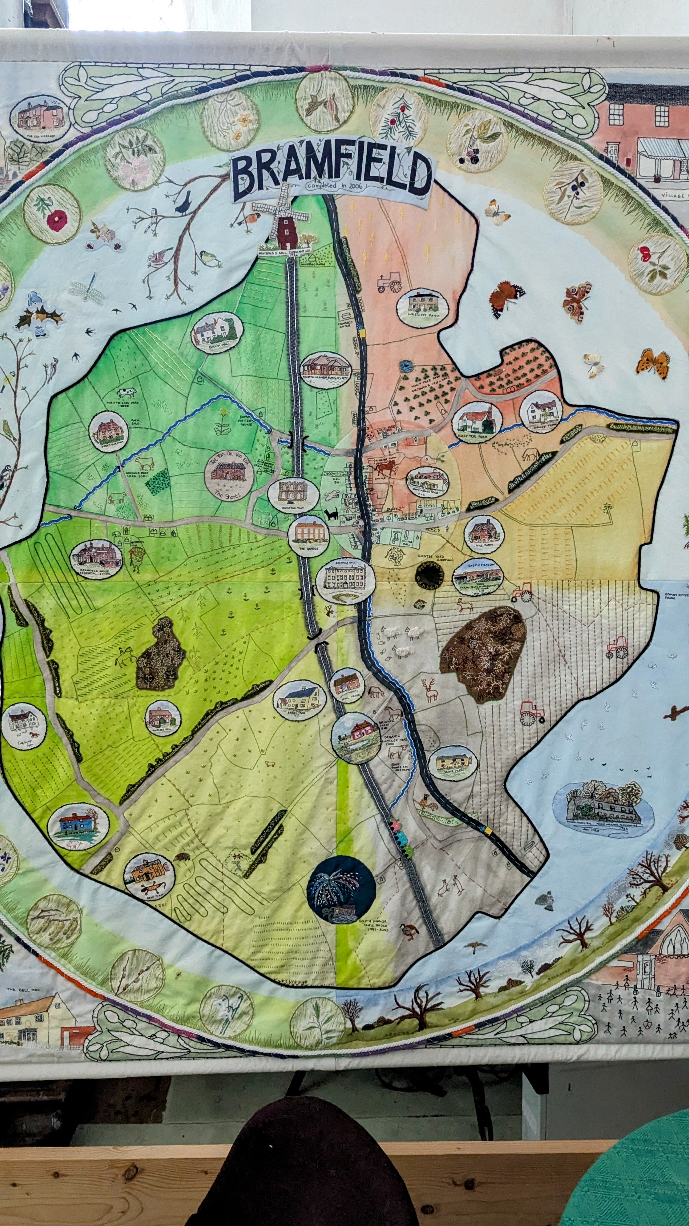 Bramfield’s parish church, hard to spot on the village tapestry,